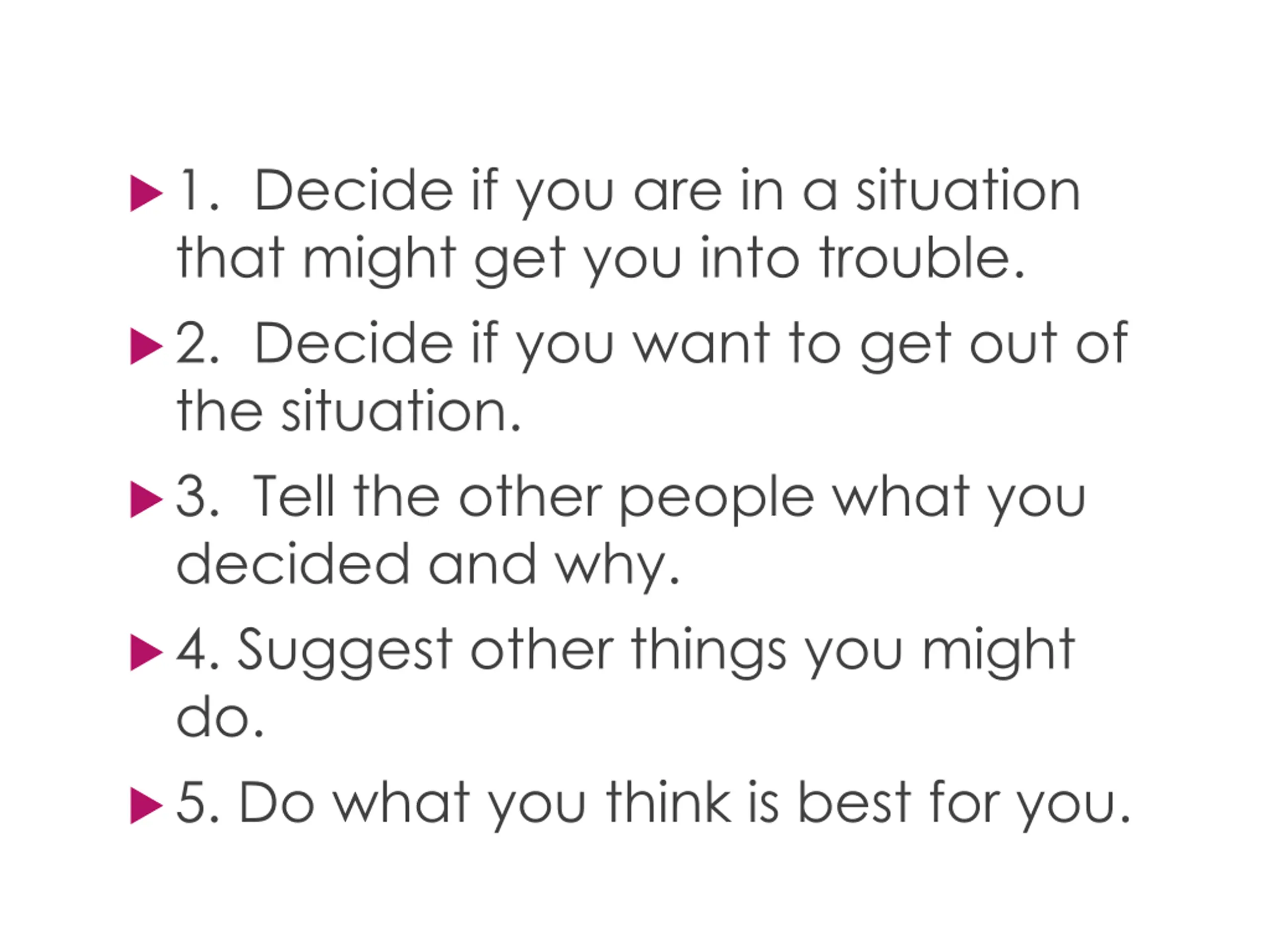 Asking Questions 1. Decide if you are in a situation that might get you into trouble. 2. Decide if you want to get out of the situation. 3. Tell the other people what you decided and why. 4. Suggest other things you might do. 5. Do what you think is best for you.