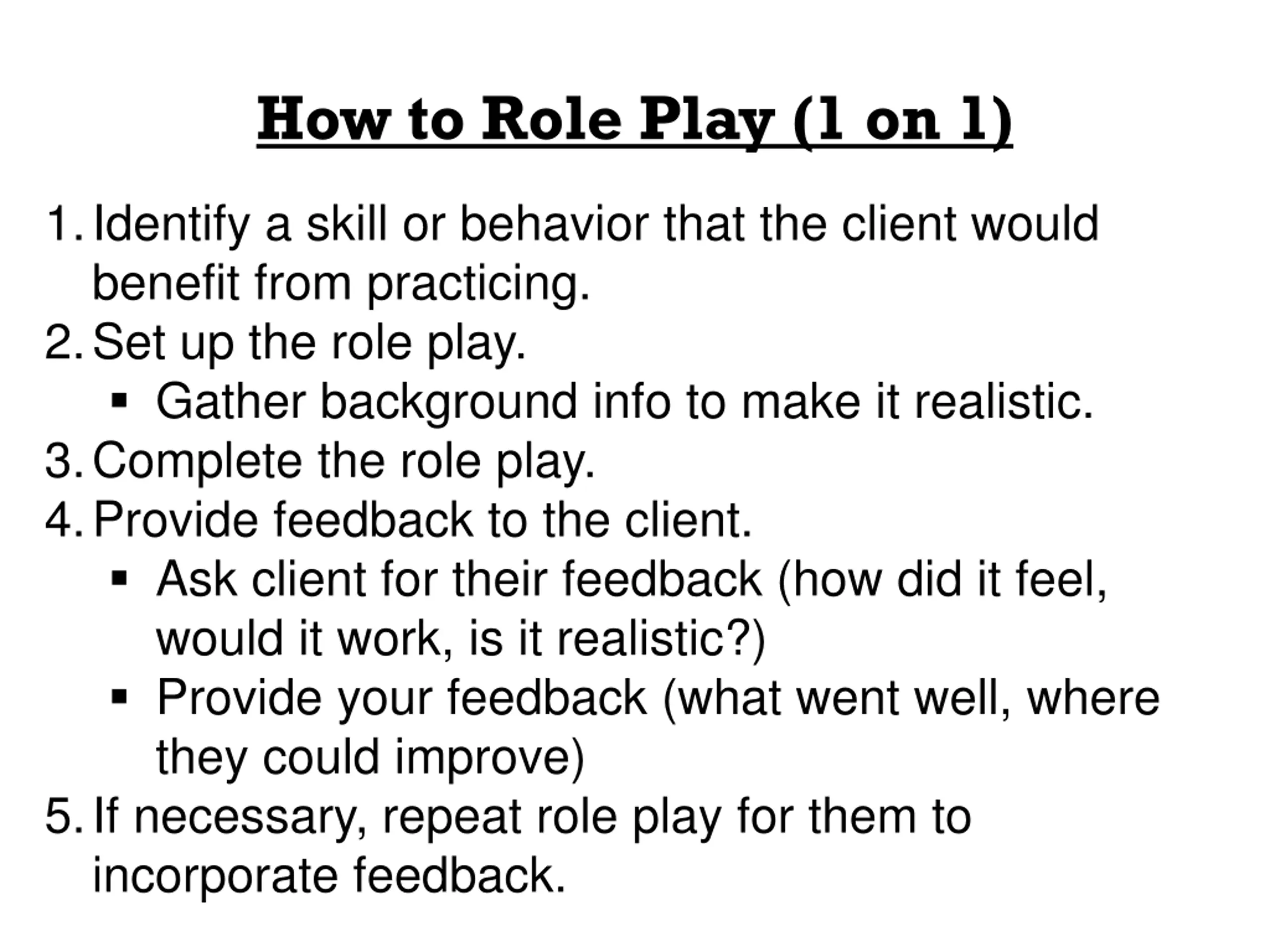 How to Role Play (1 on 1) 1.Identify a skill or behavior that the client would benefit from practicing. 2.Set up the role play. Gather background info to make it realistic. 3.Complete the role play. 4.Provide feedback to the client. Ask client for their feedback (how did it feel, would it work, is it realistic?) Provide your feedback (what went well, where they could improve) 5.If necessary, repeat role play for them to incorporate feedback.