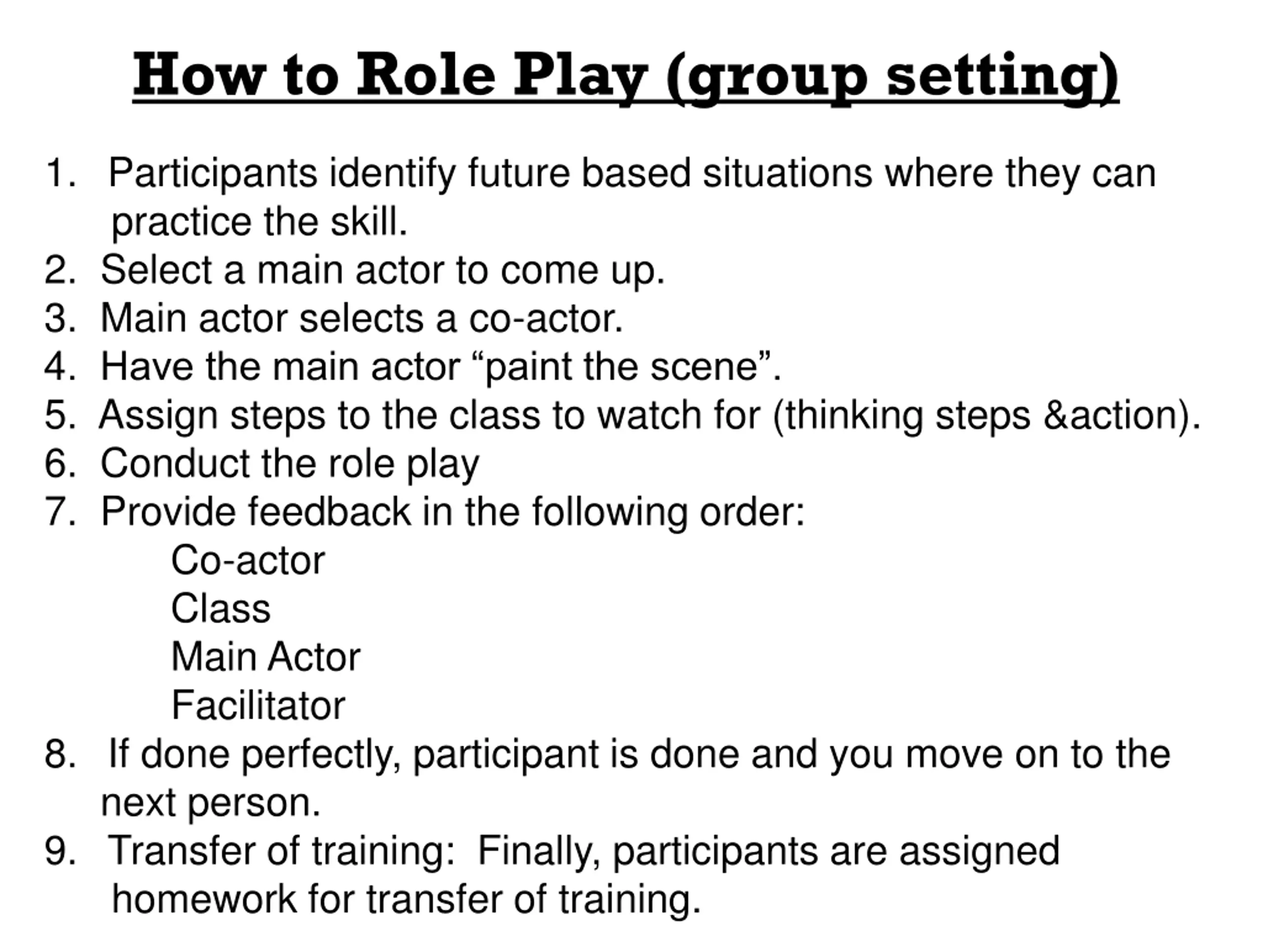 How to Role Play (group setting) 1. Participants identify future based situations where they can practice the skill. 2. Select a main actor to come up. 3. Main actor selects a co-actor. 4. Have the main actor paint the scene . 5. Assign steps to the class to watch for (thinking steps &action). 6. Conduct the role play 7. Provide feedback in the following order: Co-actor Class Main Actor Facilitator 8. If done perfectly, participant is done and you move on to the next person. 9. Transfer of training: Finally, participants are assigned homework for transfer of training.