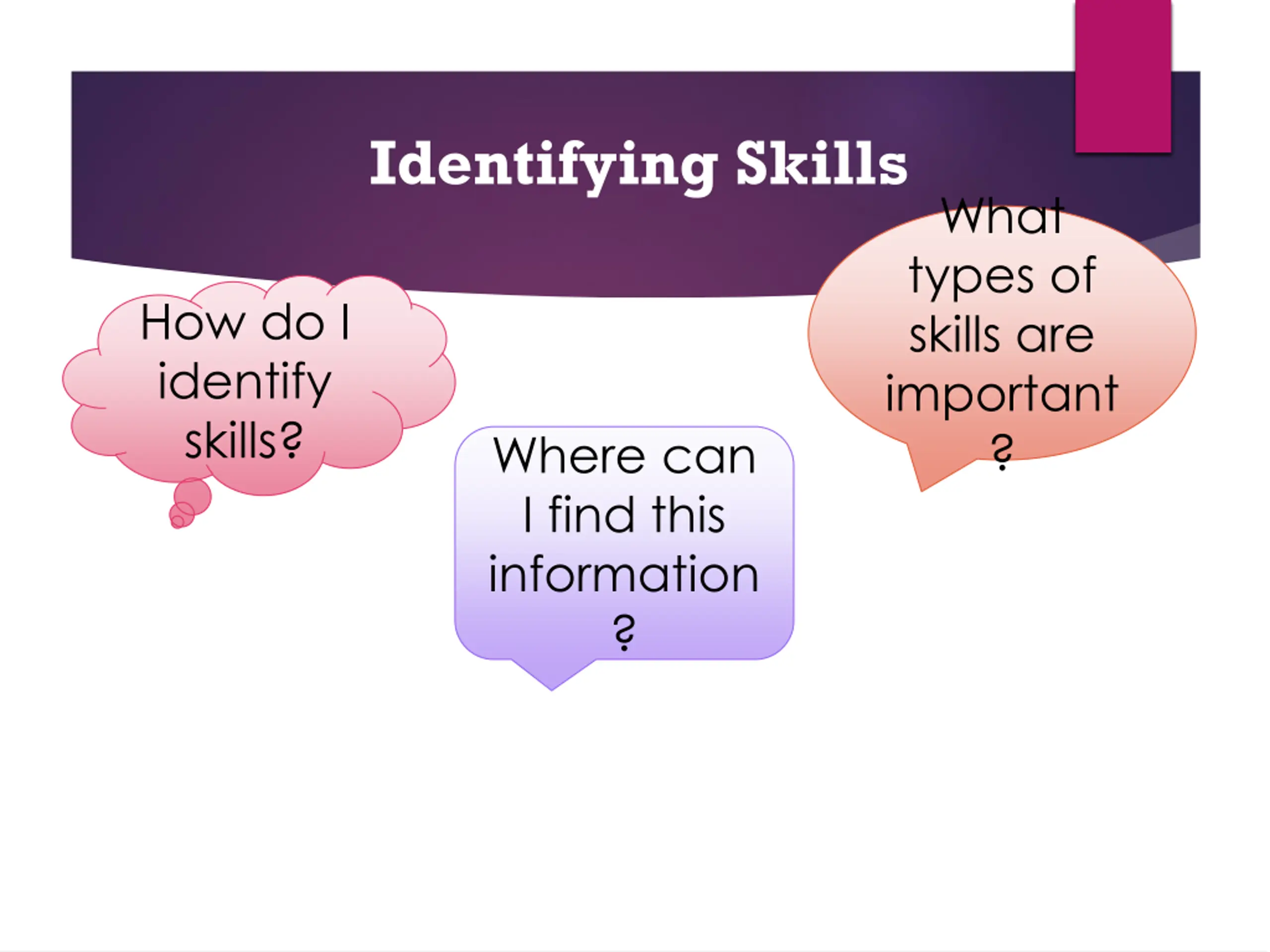 Identifying Skills What types of skills are important ? How do I identify skills? Where can I find this information ?