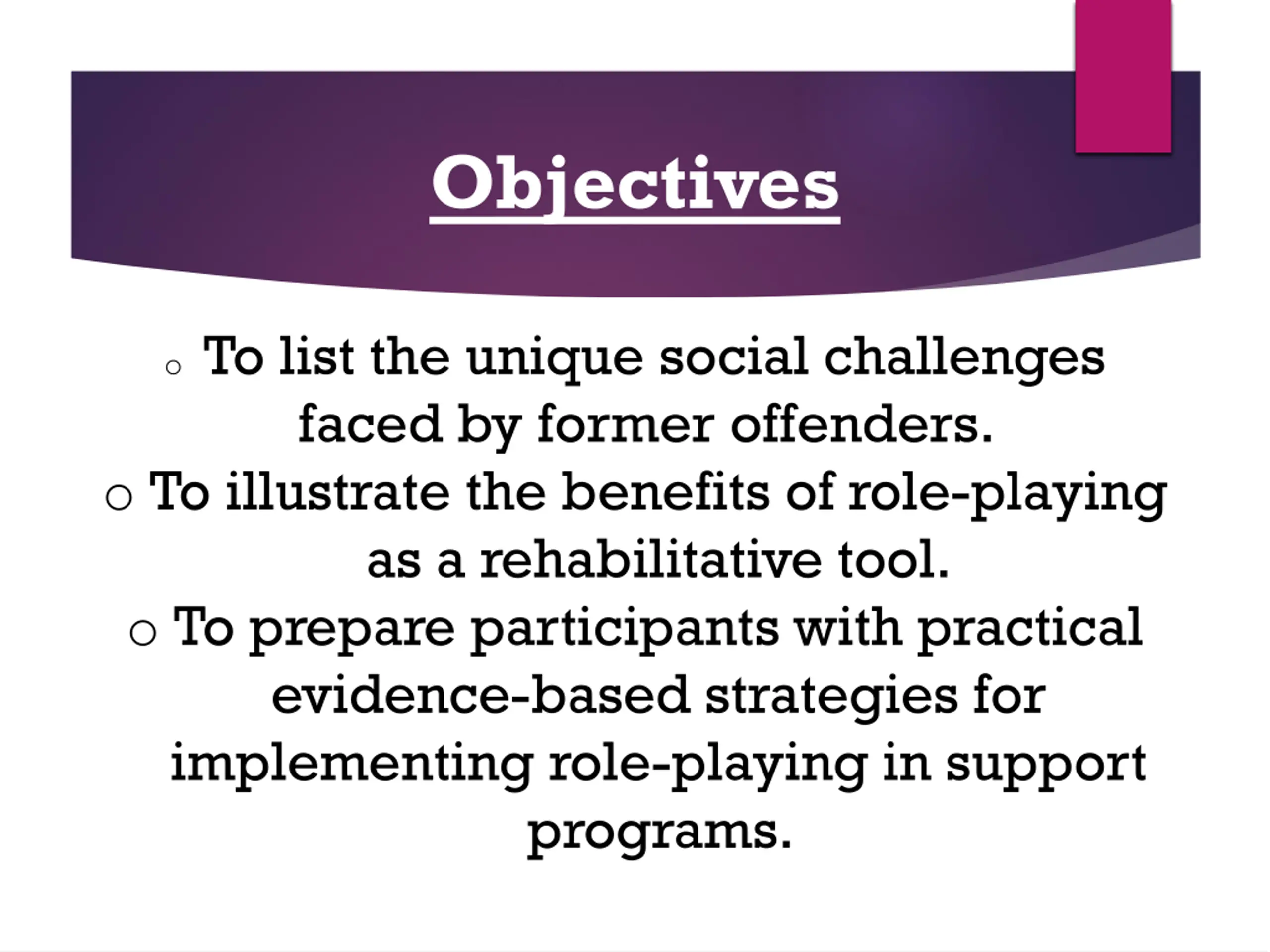 Objectives o To list the unique social challenges faced by former offenders. o To illustrate the benefits of role-playing as a rehabilitative tool. o To prepare participants with practical evidence-based strategies for implementing role-playing in support programs.