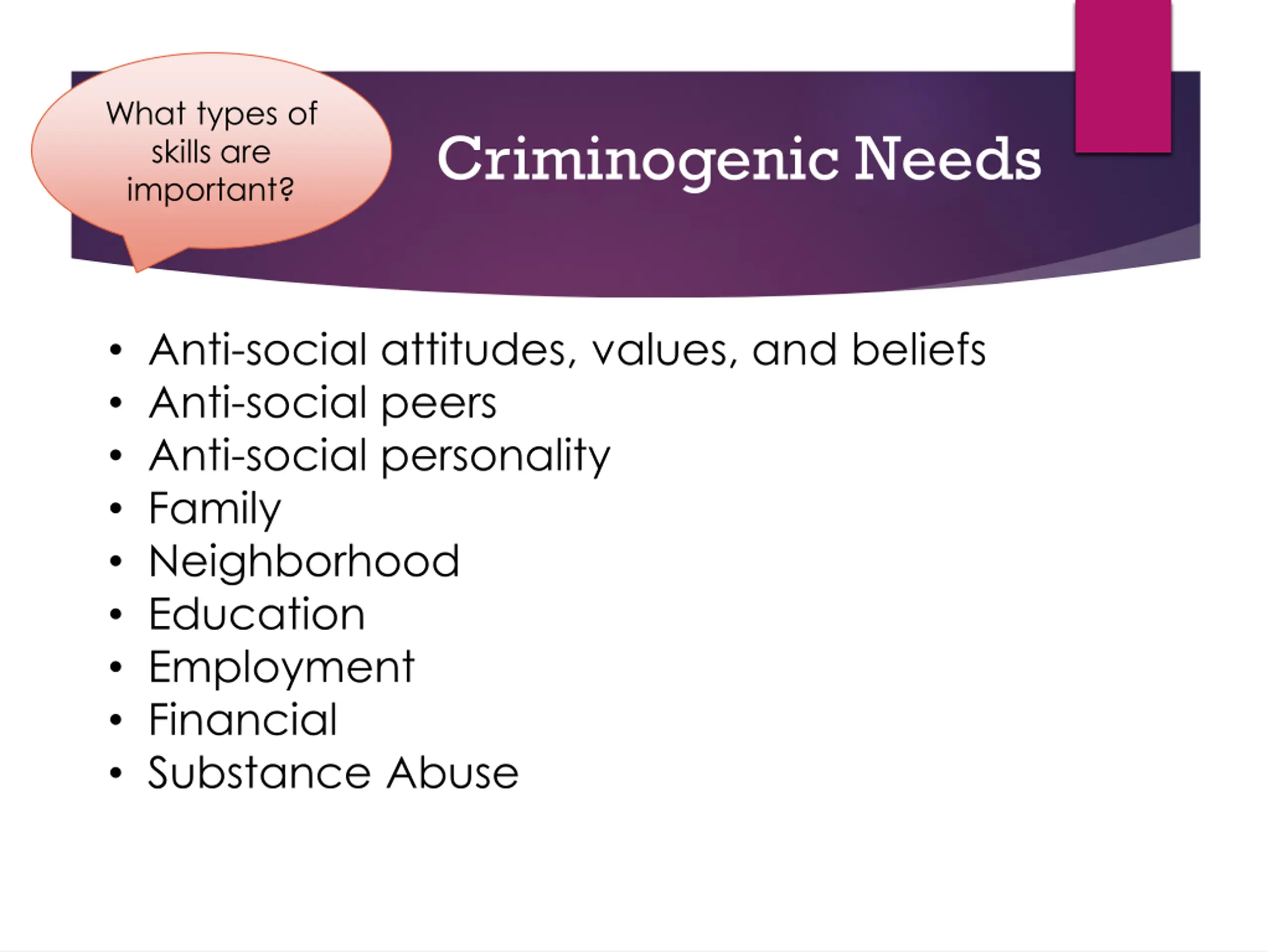 What types of skills are important? Criminogenic Needs Anti-social attitudes, values, and beliefs Anti-social peers Anti-social personality Family Neighborhood Education Employment Financial Substance Abuse