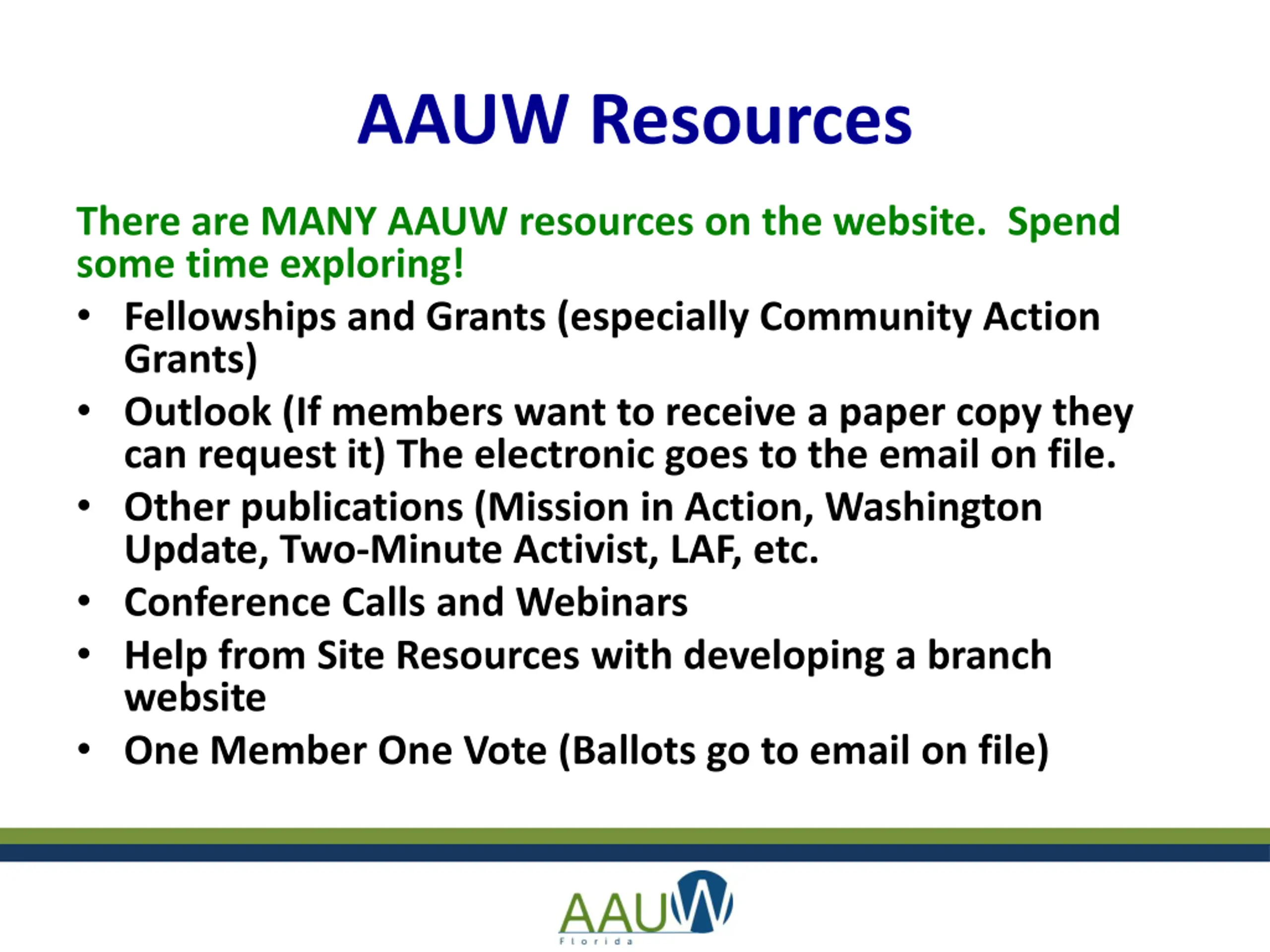 AAUW Resources There are MANY AAUW resources on the website. Spend some time exploring! Fellowships and Grants (especially Community Action Grants) Outlook (If members want to receive a paper copy they can request it) The electronic goes to the email on file. Other publications (Mission in Action, Washington Update, Two-Minute Activist, LAF, etc. Conference Calls and Webinars Help from Site Resources with developing a branch website One Member One Vote (Ballots go to email on file)