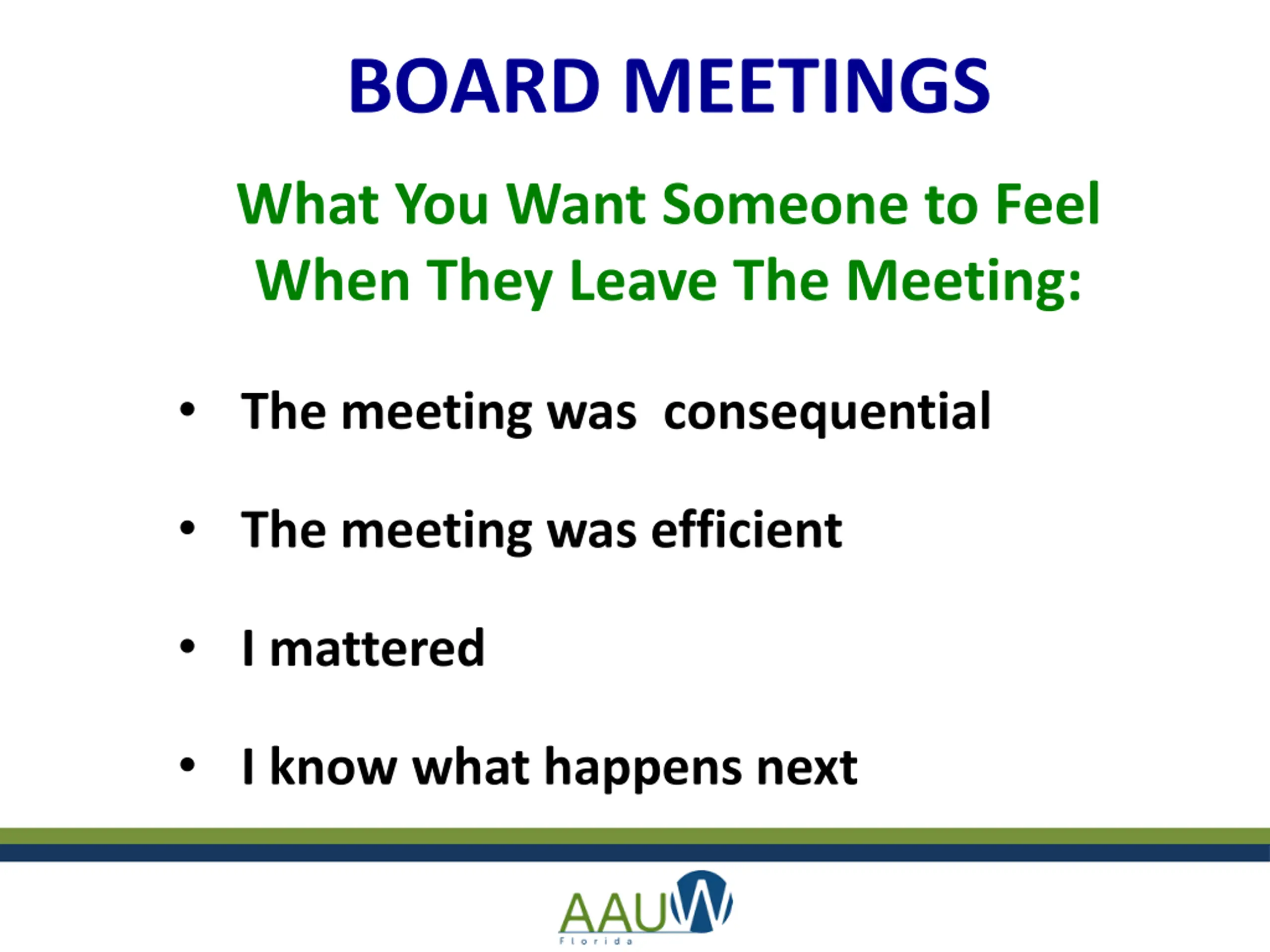 BOARD MEETINGS What You Want Someone to Feel When They Leave The Meeting: The meeting was consequential The meeting was efficient I mattered I know what happens next