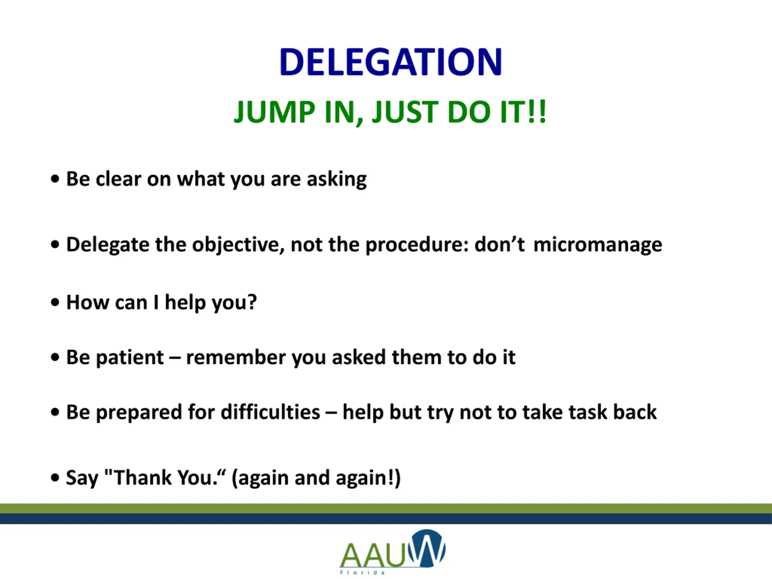 DELEGATION JUMP IN, JUST DO IT!! Be clear on what you are asking Delegate the objective, not the procedure: don tmicromanage How can I help you? Be patient remember you asked them to do it Be prepared for difficulties help but try not to take task back Say "Thank You. (again and again!)