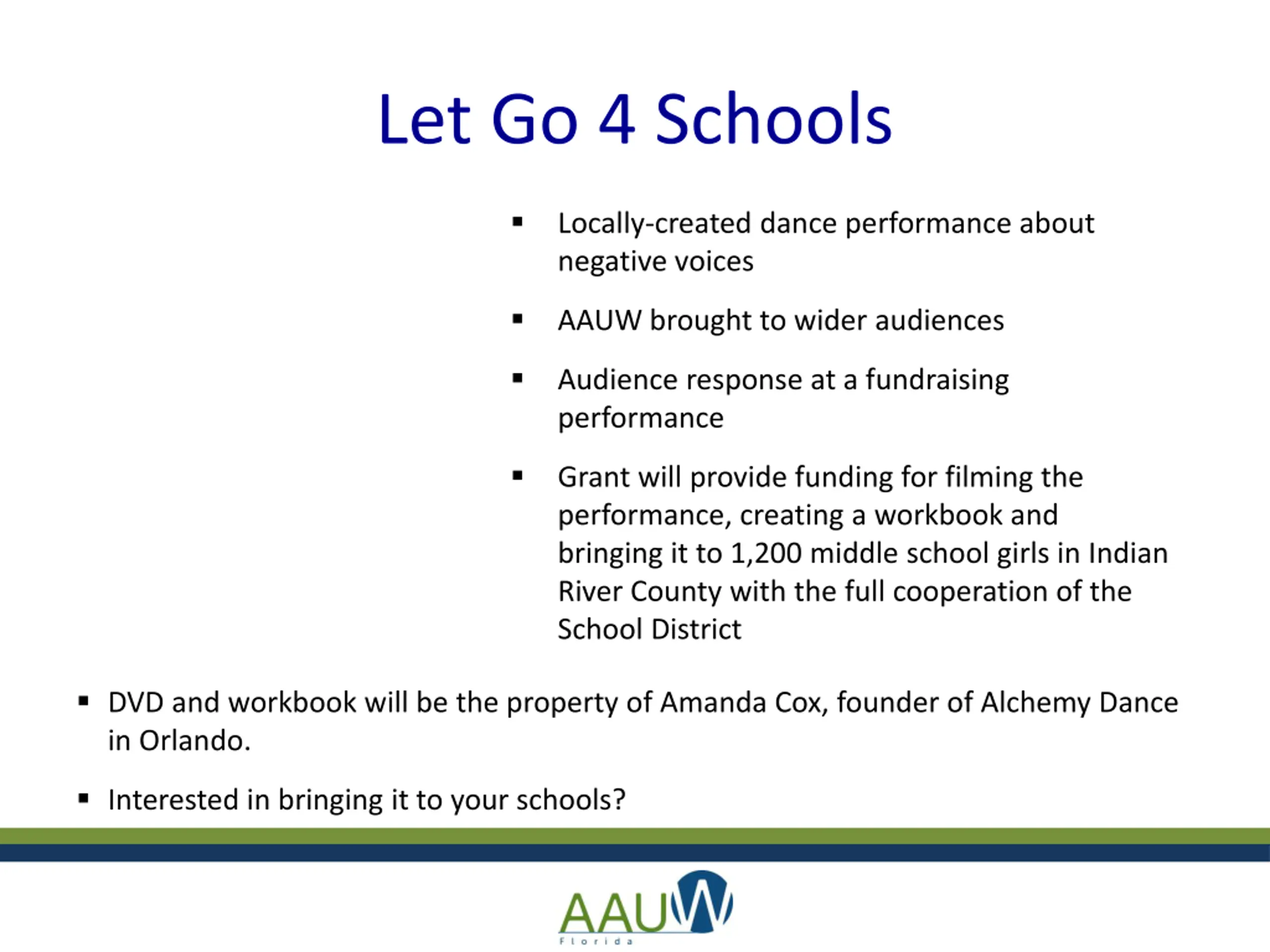 Let Go 4 Schools Locally-created dance performance about negative voices AAUW brought to wider audiences Audience response at a fundraising performance Grant will provide funding for filming the performance, creating a workbook and bringing it to 1,200 middle school girls in Indian River County with the full cooperation of the School District DVD and workbook will be the property of Amanda Cox, founder of Alchemy Dance in Orlando. Interested in bringing it to your schools?