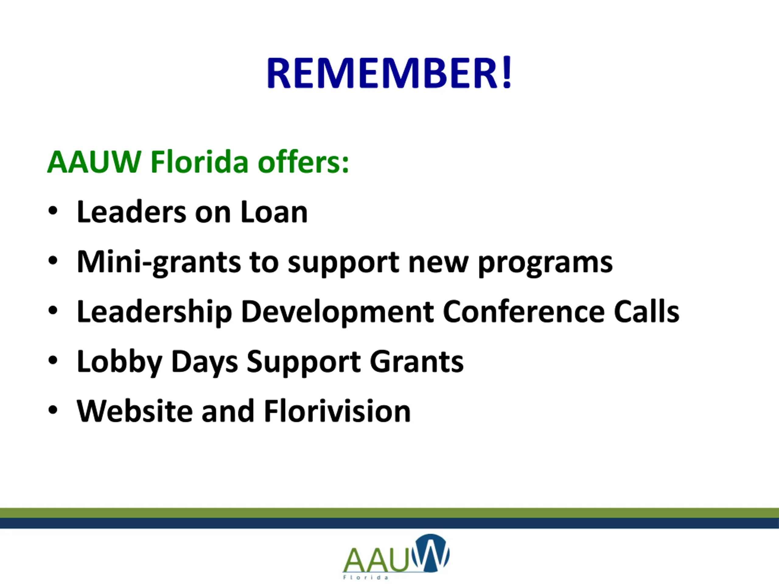 REMEMBER! AAUW Florida offers: Leaders on Loan Mini-grants to support new programs Leadership Development Conference Calls Lobby Days Support Grants Website and Florivision