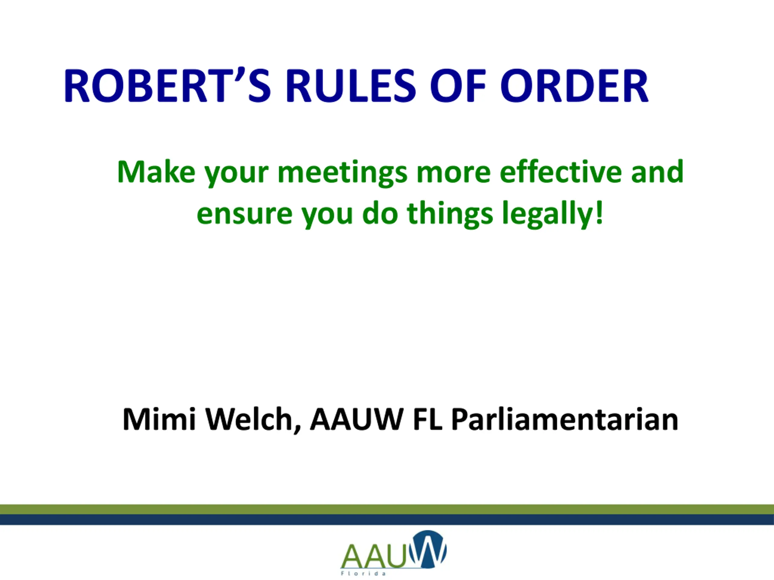 ROBERTS RULES OF ORDER Make your meetings more effective and ensure you do things legally! Mimi Welch, AAUW FL Parliamentarian