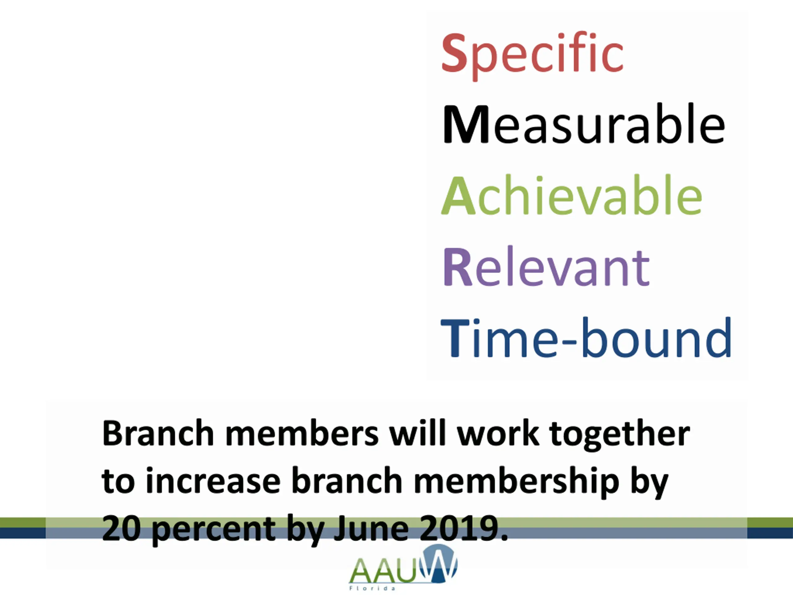Specific Measurable Achievable Relevant Time-bound Branch members will work together to increase branch membership by 20 percent by June 2019.