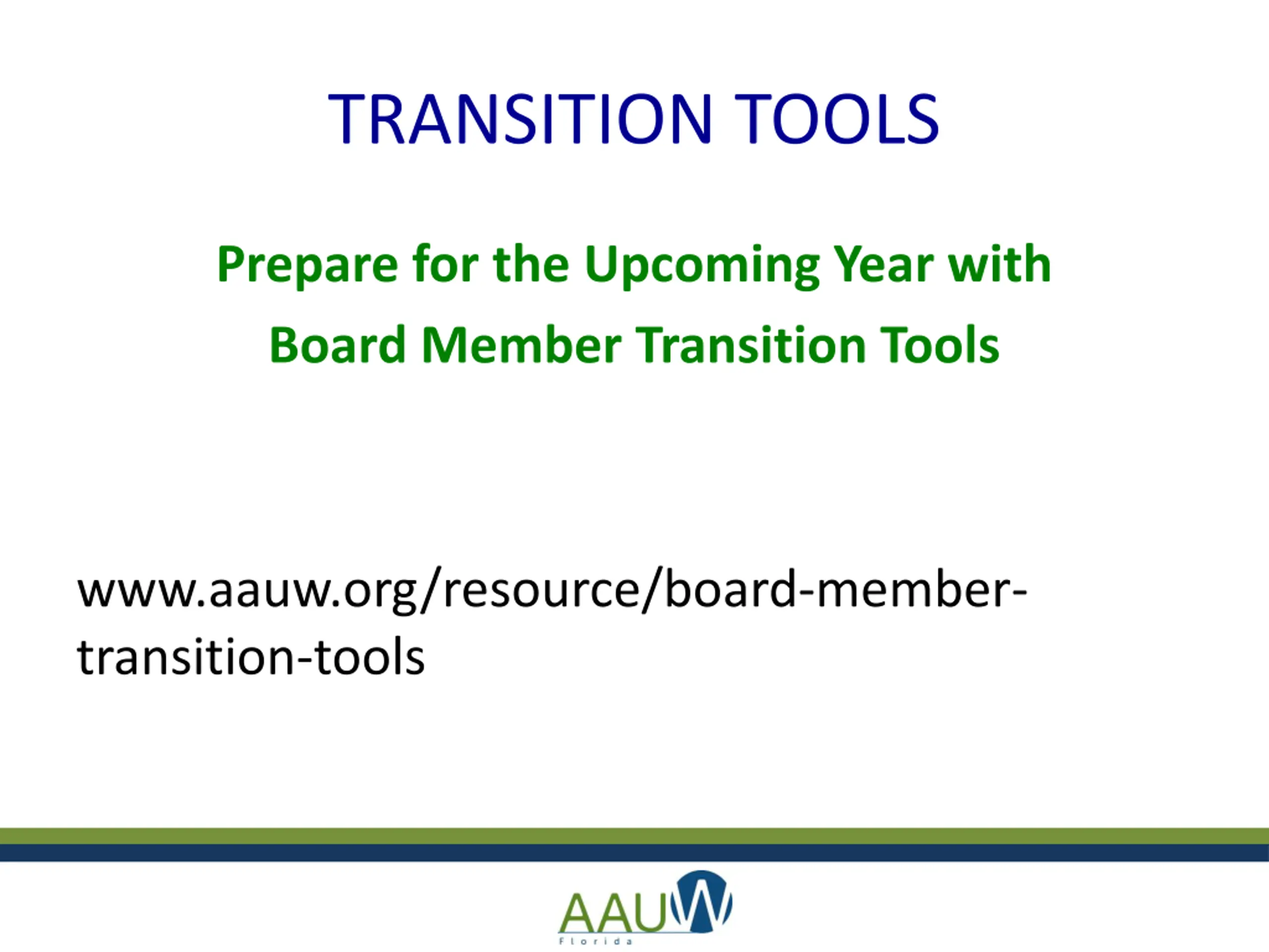 TRANSITION TOOLS Prepare for the Upcoming Year with Board Member Transition Tools www.aauw.org/resource/board-member- transition-tools