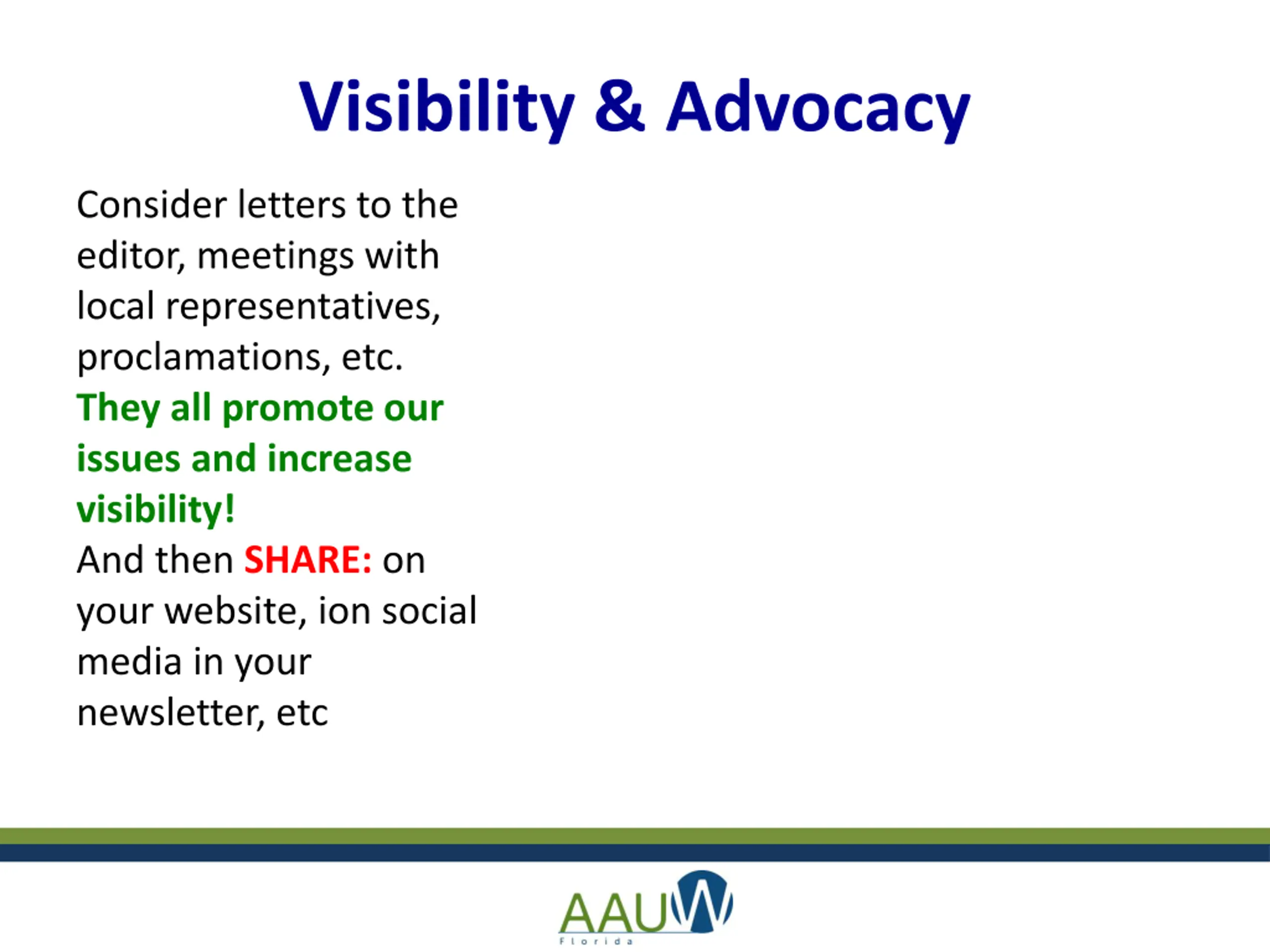 Visibility & Advocacy Consider letters to the editor, meetings with local representatives, proclamations, etc. They all promote our issues and increase visibility! And then SHARE: on your website, ion social media in your newsletter, etc