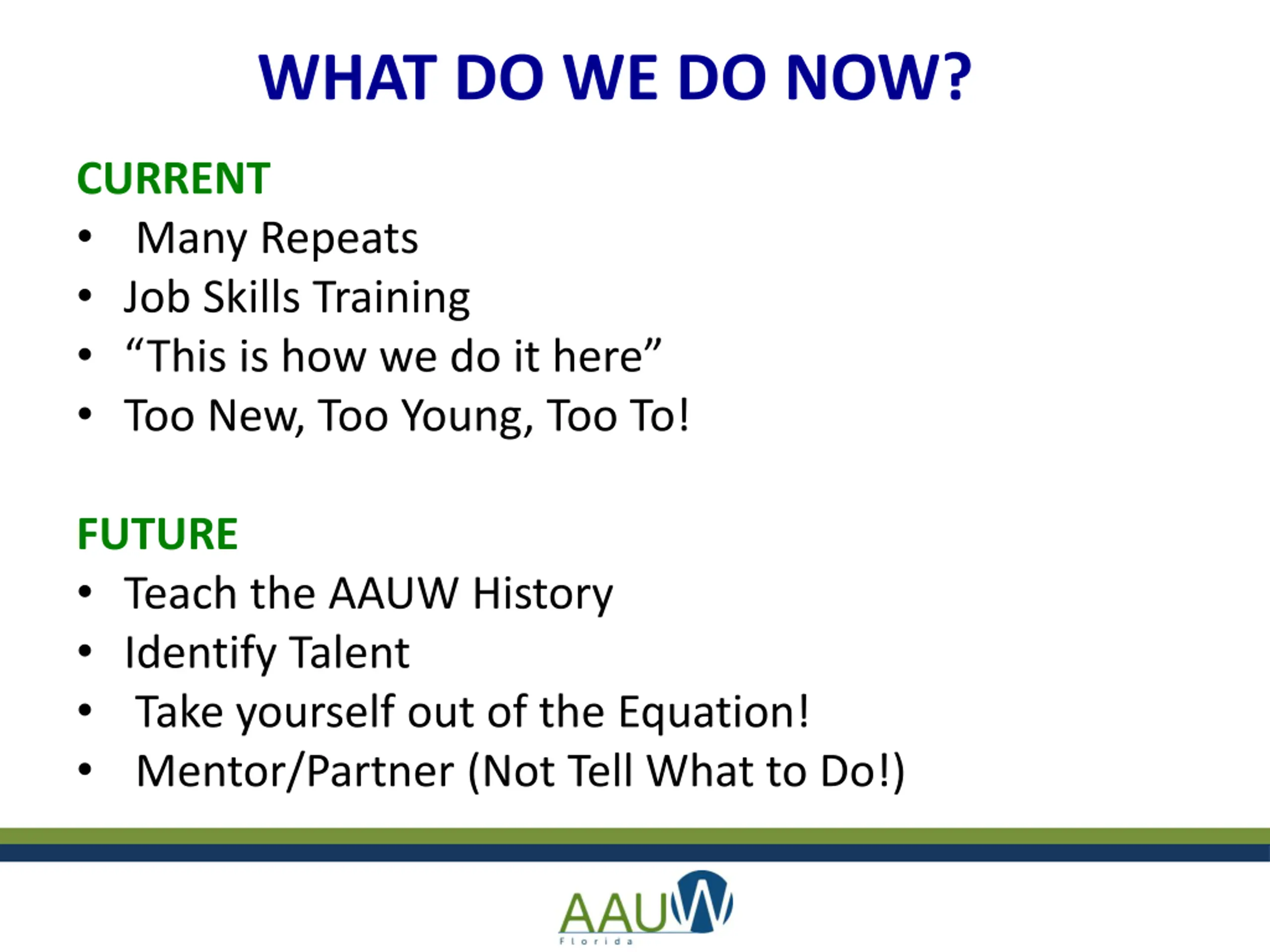 WHAT DO WE DO NOW? CURRENT Many Repeats Job Skills Training This is how we do it here Too New, Too Young, Too To! FUTURE Teach the AAUW History Identify Talent Take yourself out of the Equation! Mentor/Partner (Not Tell What to Do!)