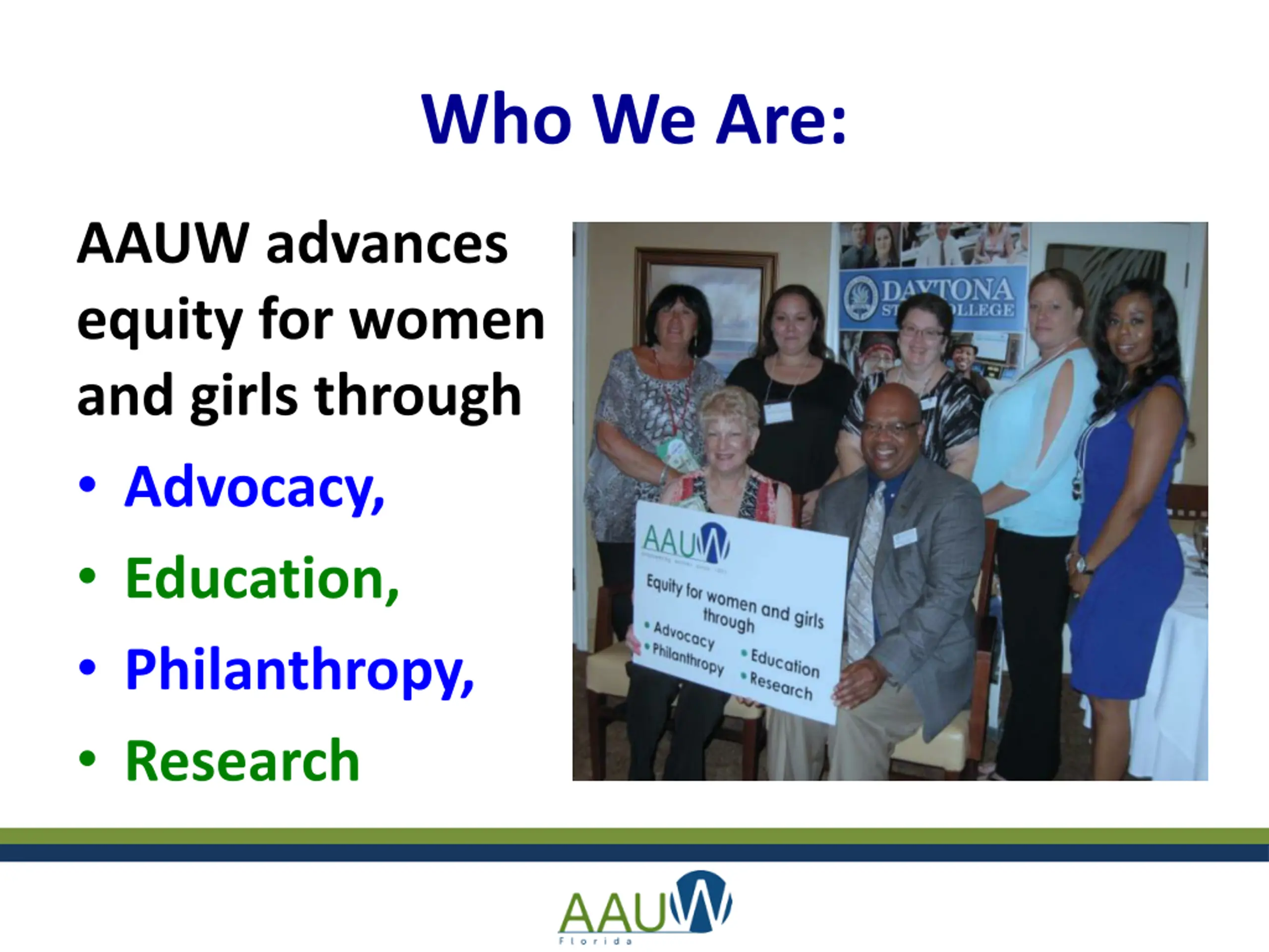 Who We Are: AAUW advances equity for women and girls through Advocacy, Education, Philanthropy, Research