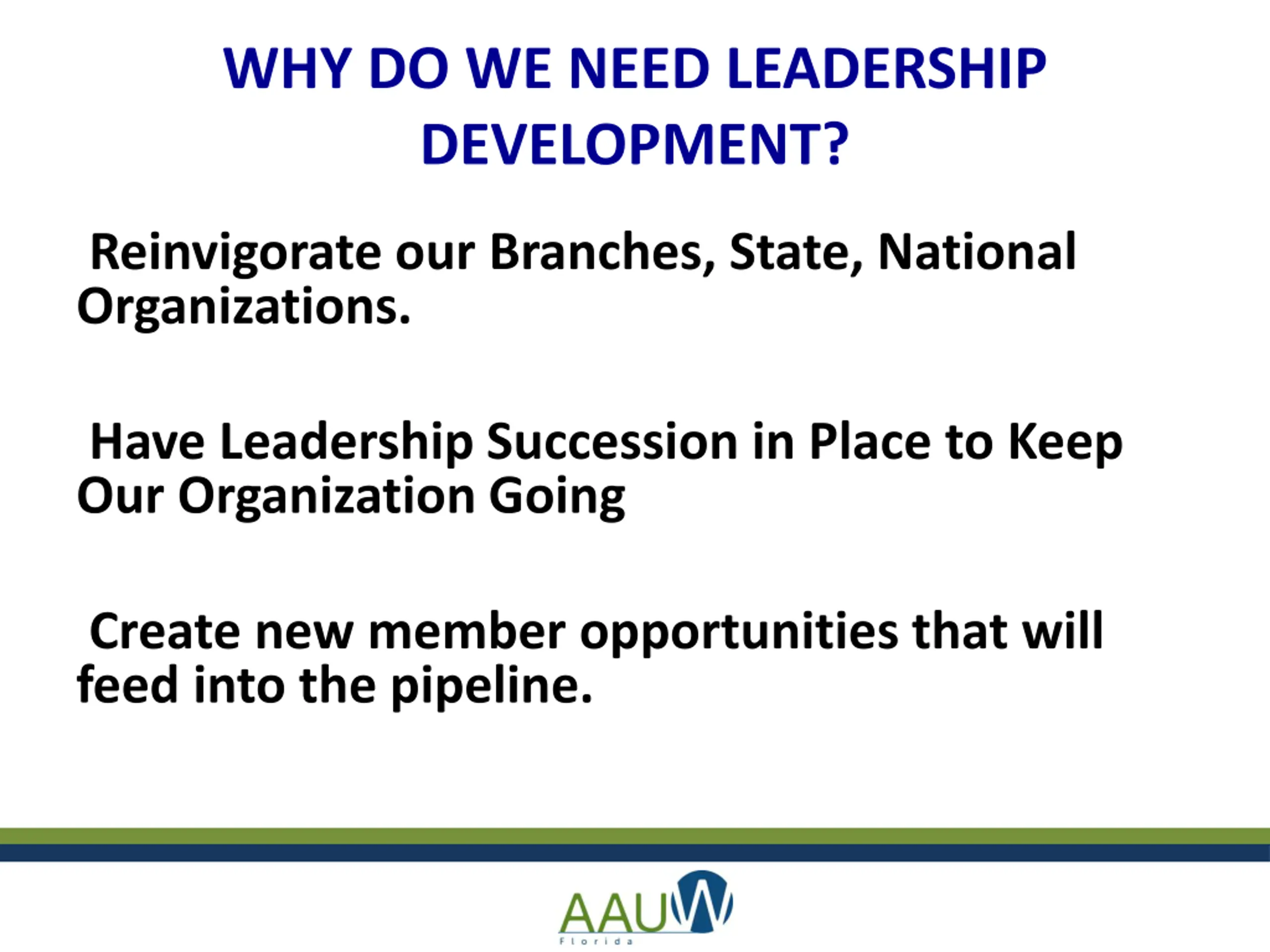 WHY DO WE NEED LEADERSHIP DEVELOPMENT? Reinvigorate our Branches, State, National Organizations. Have Leadership Succession in Place to Keep Our Organization Going Create new member opportunities that will feed into the pipeline.