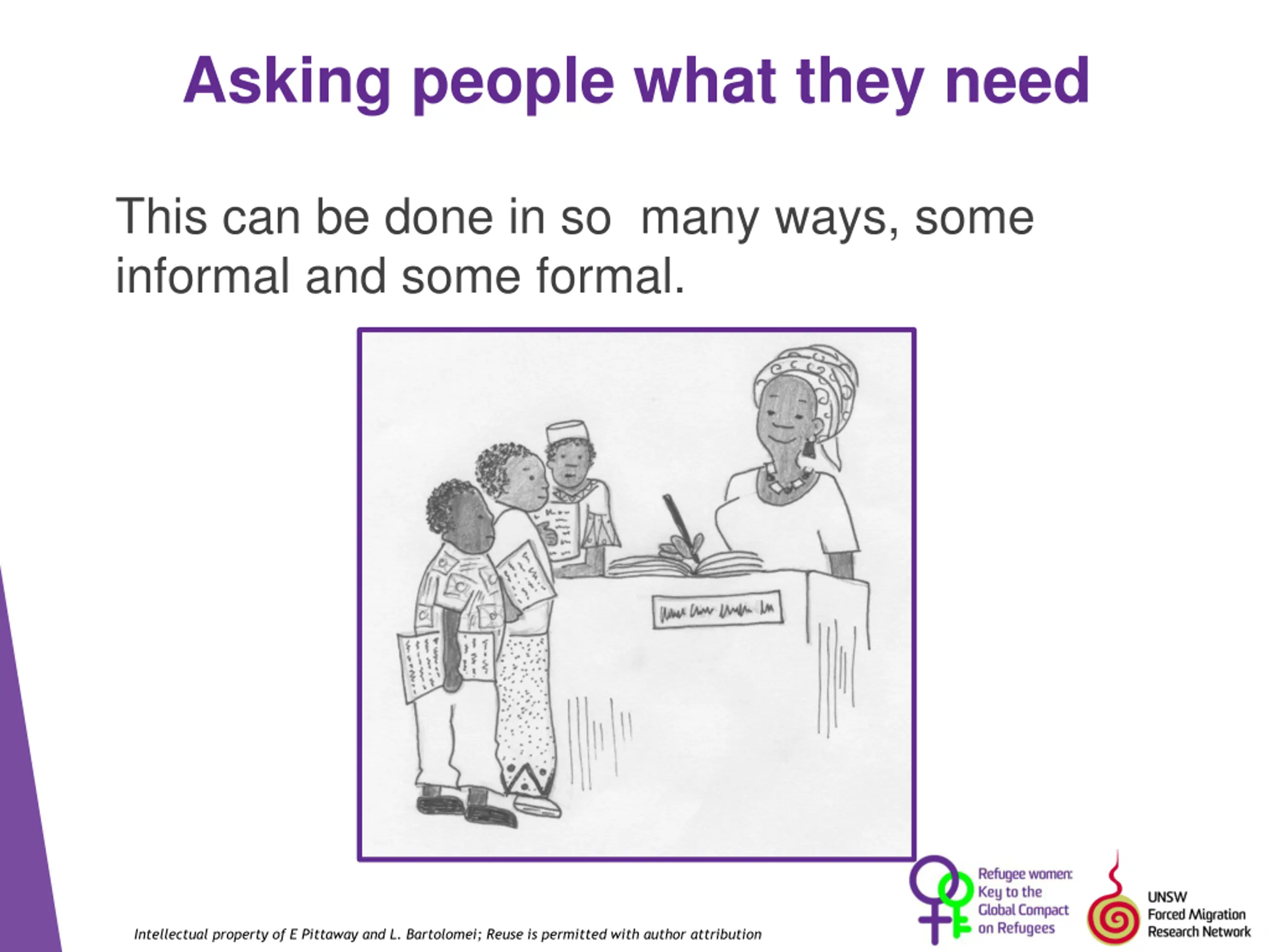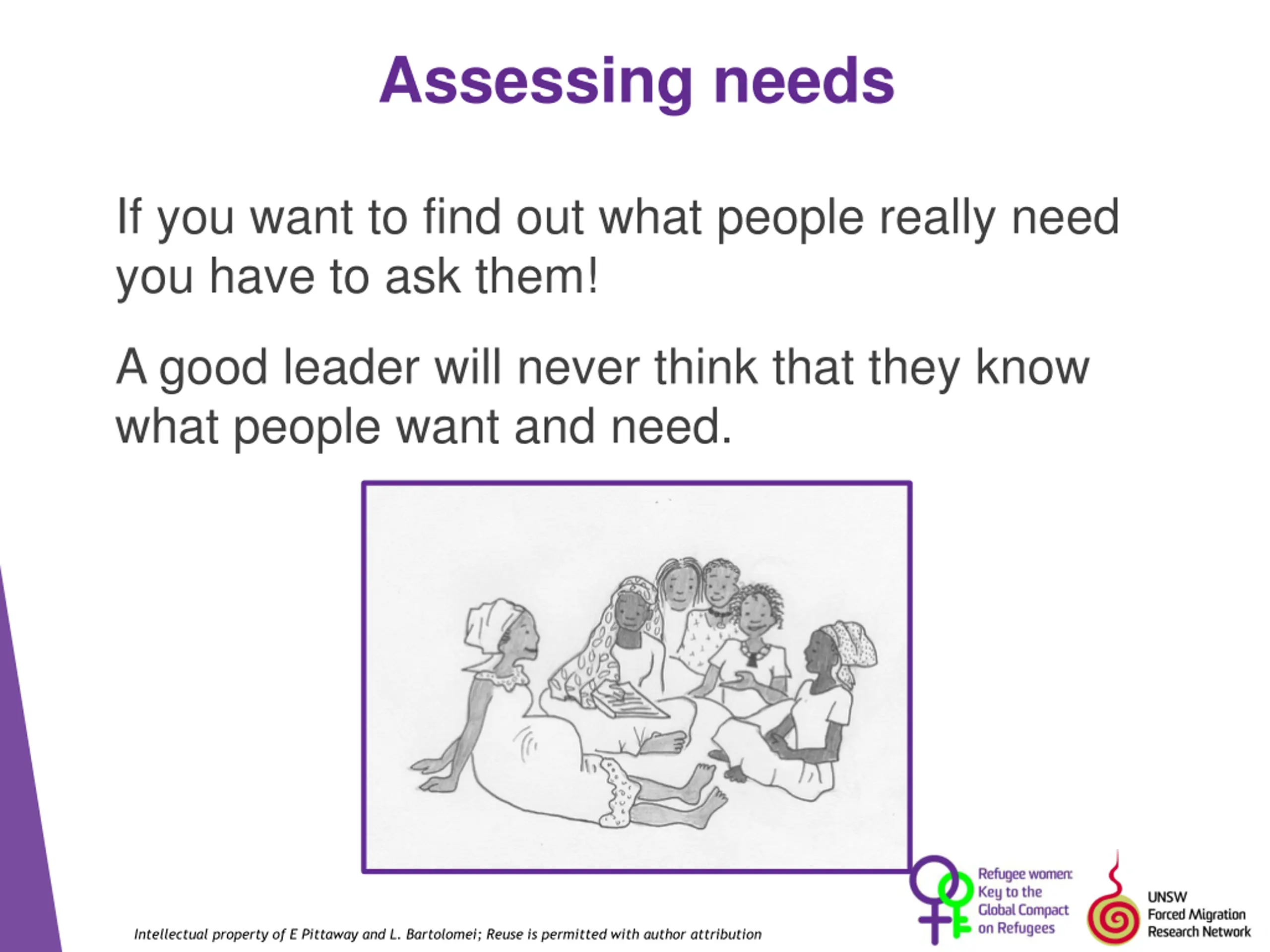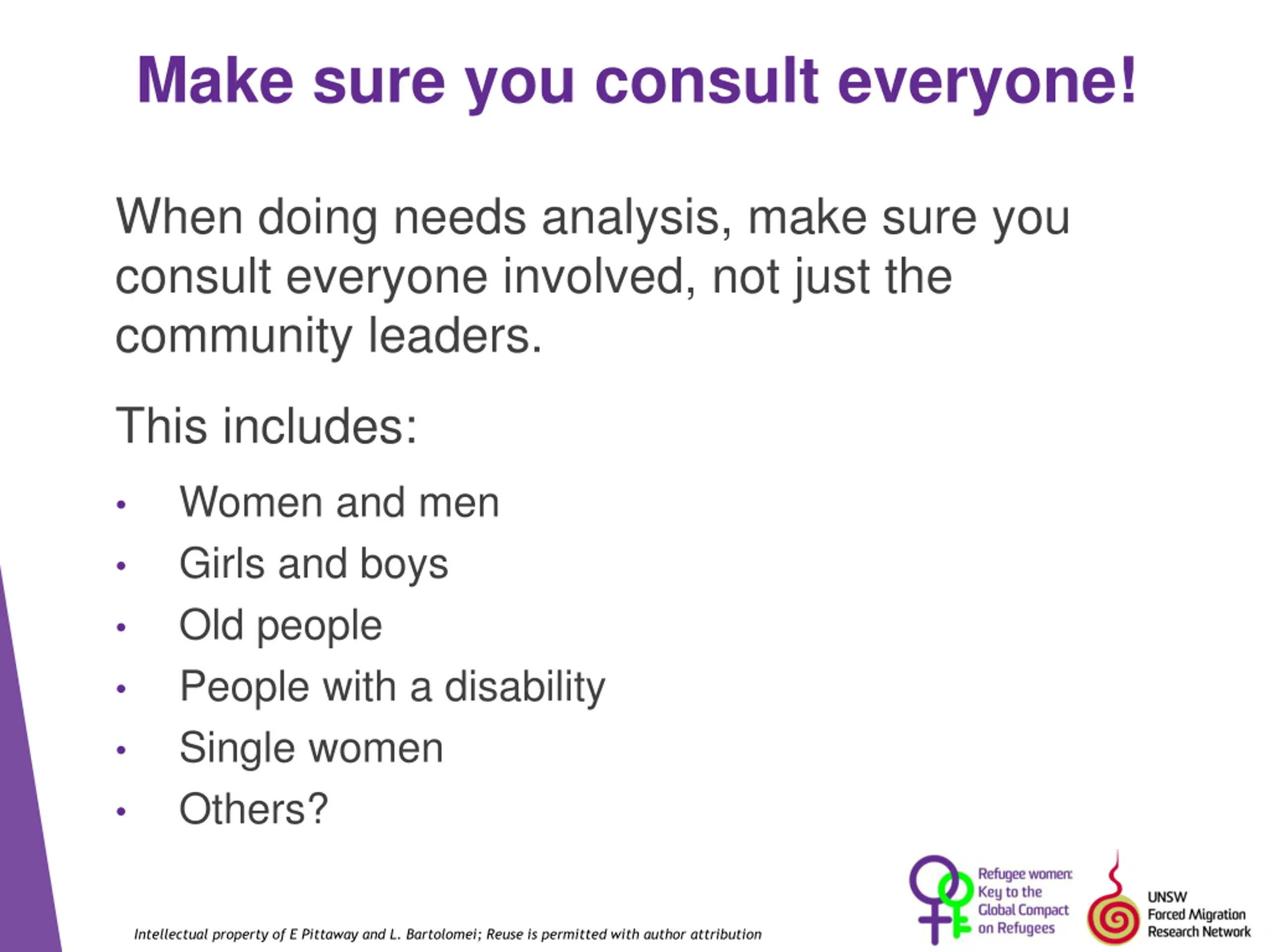 Make sure you consult everyone! When doing needs analysis, make sure you consult everyone involved, not just the community leaders. This includes: Women and men Girls and boys Old people People with a disability Single women Others? Intellectual property of E Pittaway and L. Bartolomei; Reuse is permitted with author attribution