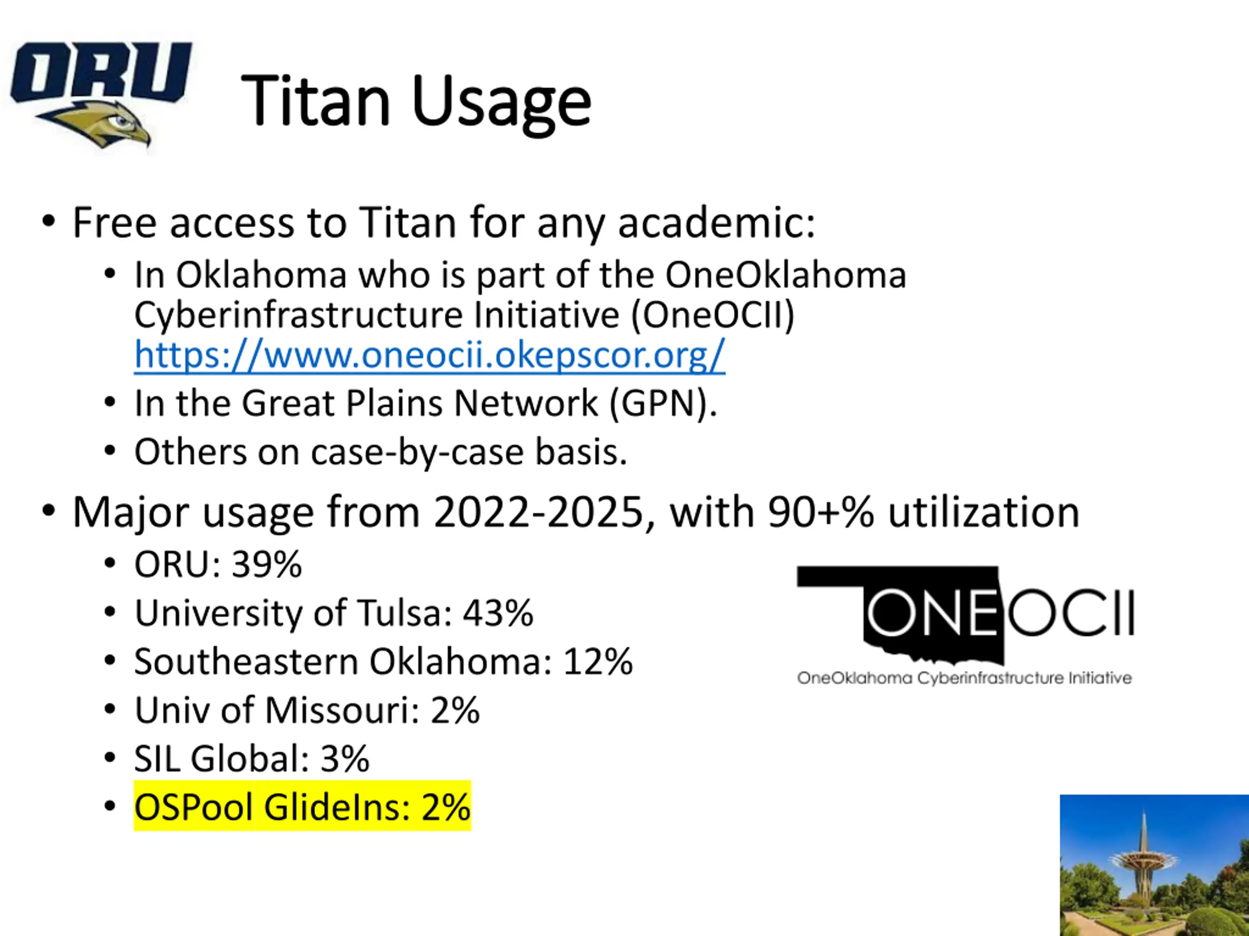 Titan Usage Titan Usage Free access to Titan for any academic: In Oklahoma who is part of the OneOklahoma Cyberinfrastructure Initiative (OneOCII) https://www.oneocii.okepscor.org/ In the Great Plains Network (GPN). Others on case-by-case basis. Major usage from 2022-2025, with 90+% utilization ORU: 39% University of Tulsa: 43% Southeastern Oklahoma: 12% Univ of Missouri: 2% SIL Global: 3% OSPool GlideIns: 2%