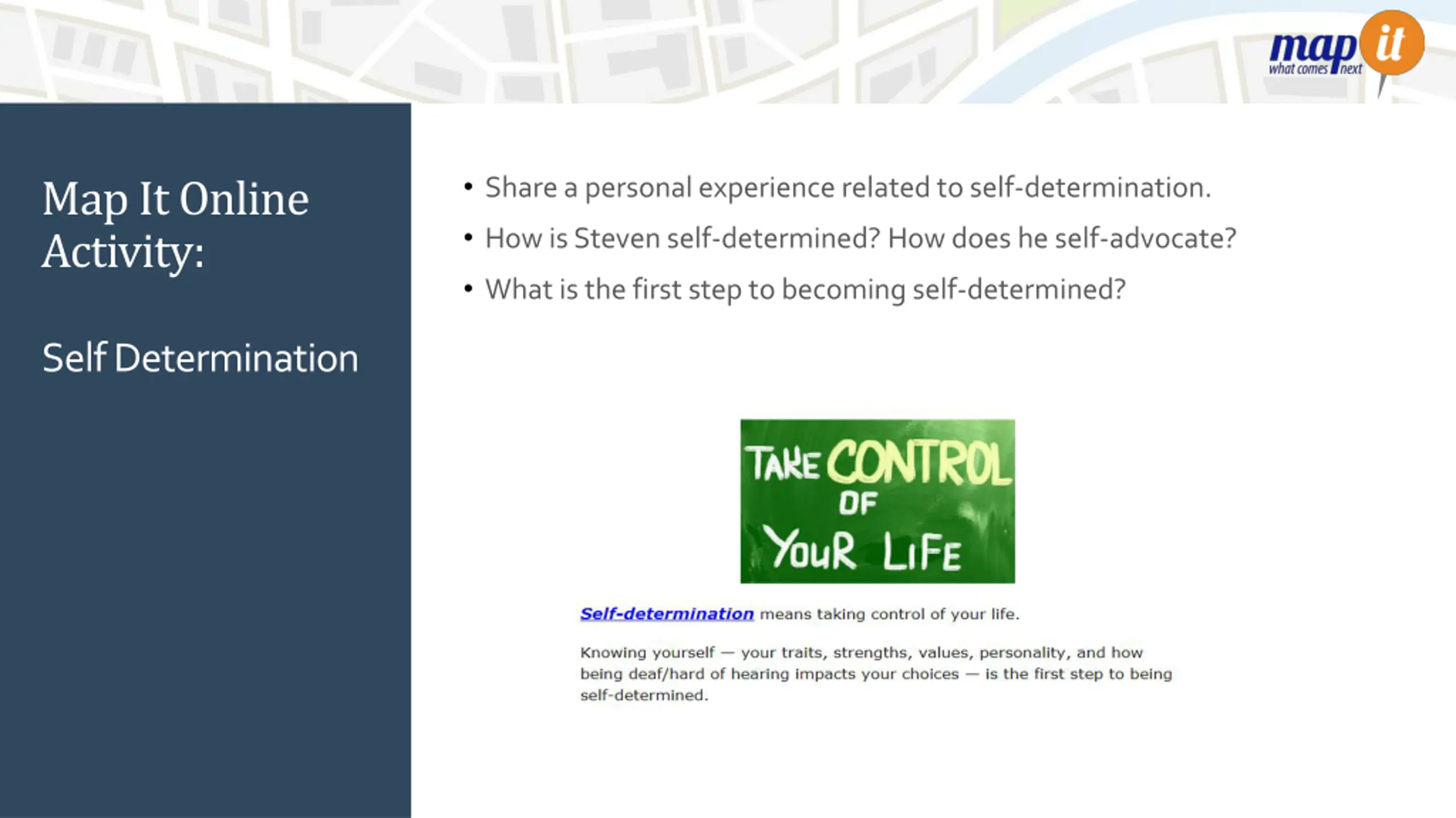 Map It Online Activity: Share a personal experience related to self-determination. How is Steven self-determined? How does he self-advocate? What is the first step to becoming self-determined? Self Determination