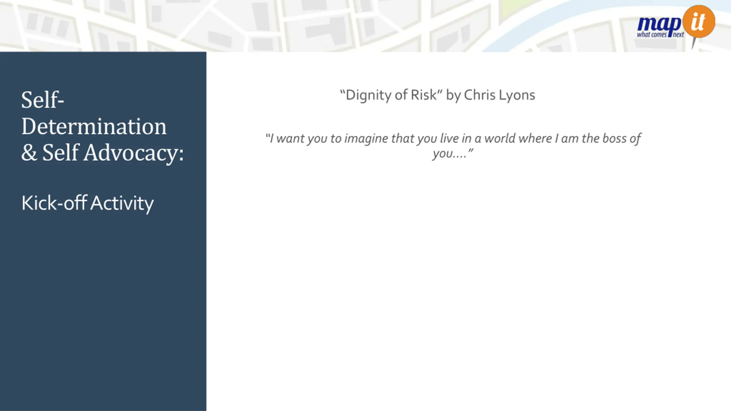 Self- Determination & Self Advocacy: Dignity of Risk by Chris Lyons I want you to imagine that you live in a world where I am the boss of you . Kick-off Activity
