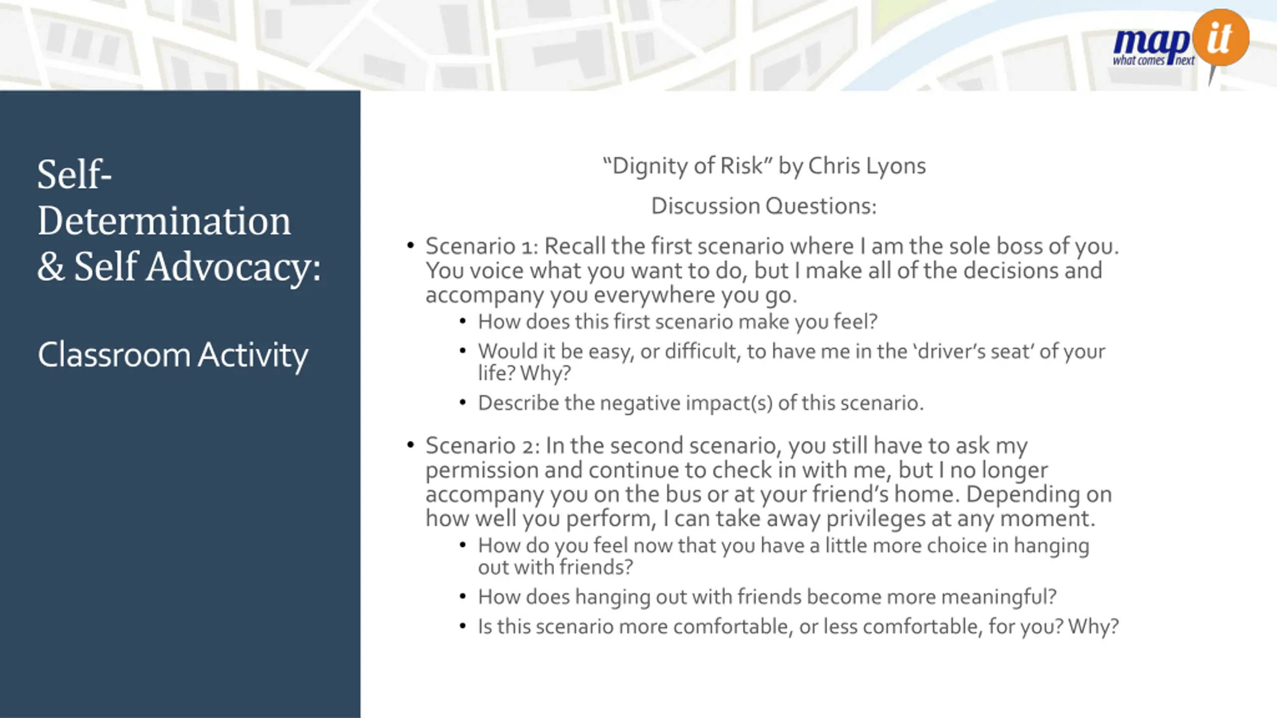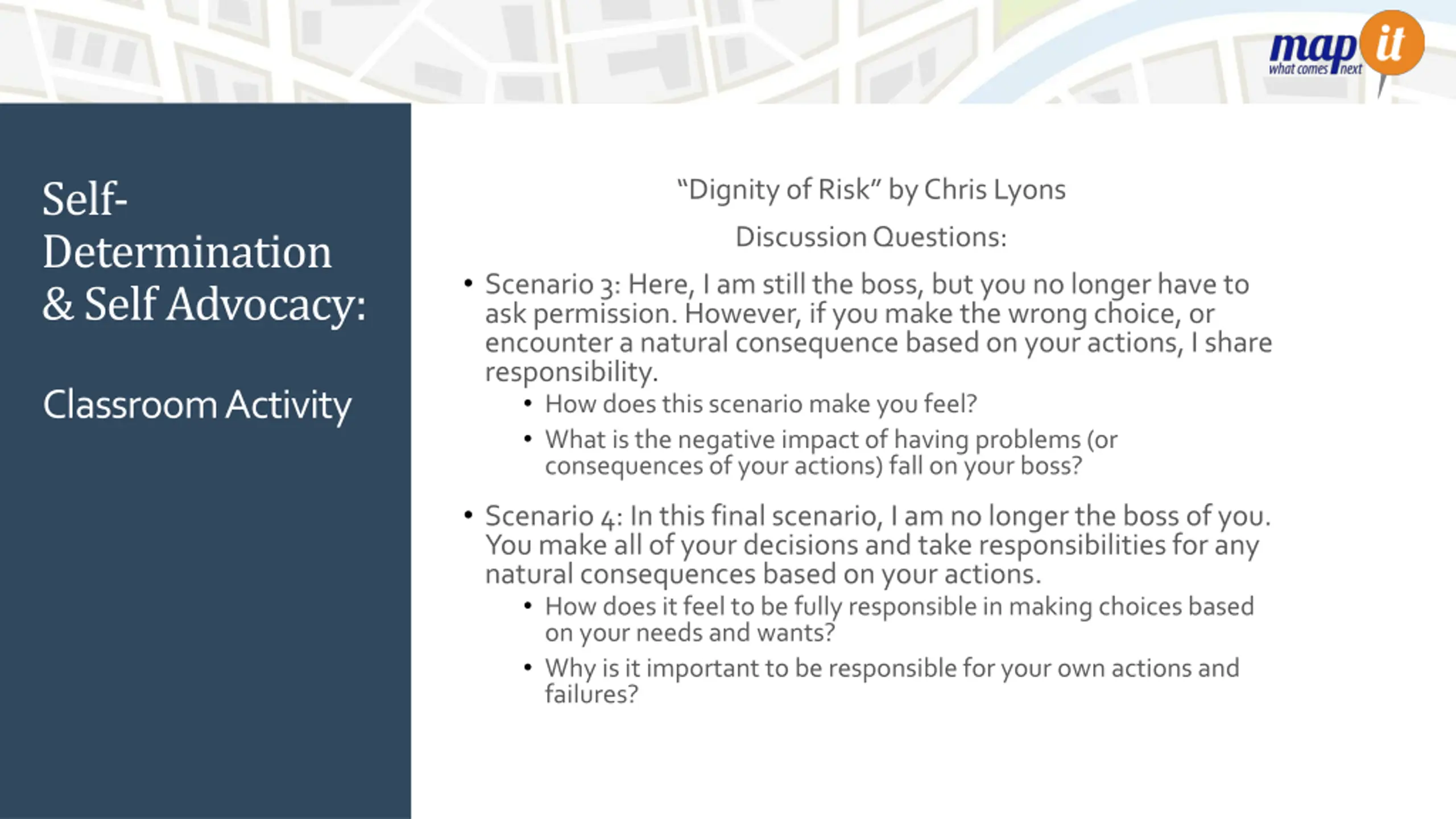 Self- Determination & Self Advocacy: Dignity of Risk by Chris Lyons Discussion Questions: Scenario 3: Here, I am still the boss, but you no longer have to ask permission. However, if you make the wrong choice, or encounter a natural consequence based on your actions, I share responsibility. How does this scenario make you feel? What is the negative impact of having problems (or consequences of your actions) fall on your boss? Classroom Activity Scenario 4: In this final scenario, I am no longer the boss of you. You make all of your decisions and take responsibilities for any natural consequences based on your actions. How does it feel to be fully responsible in making choices based on your needs and wants? Why is it important to be responsible for your own actions and failures?