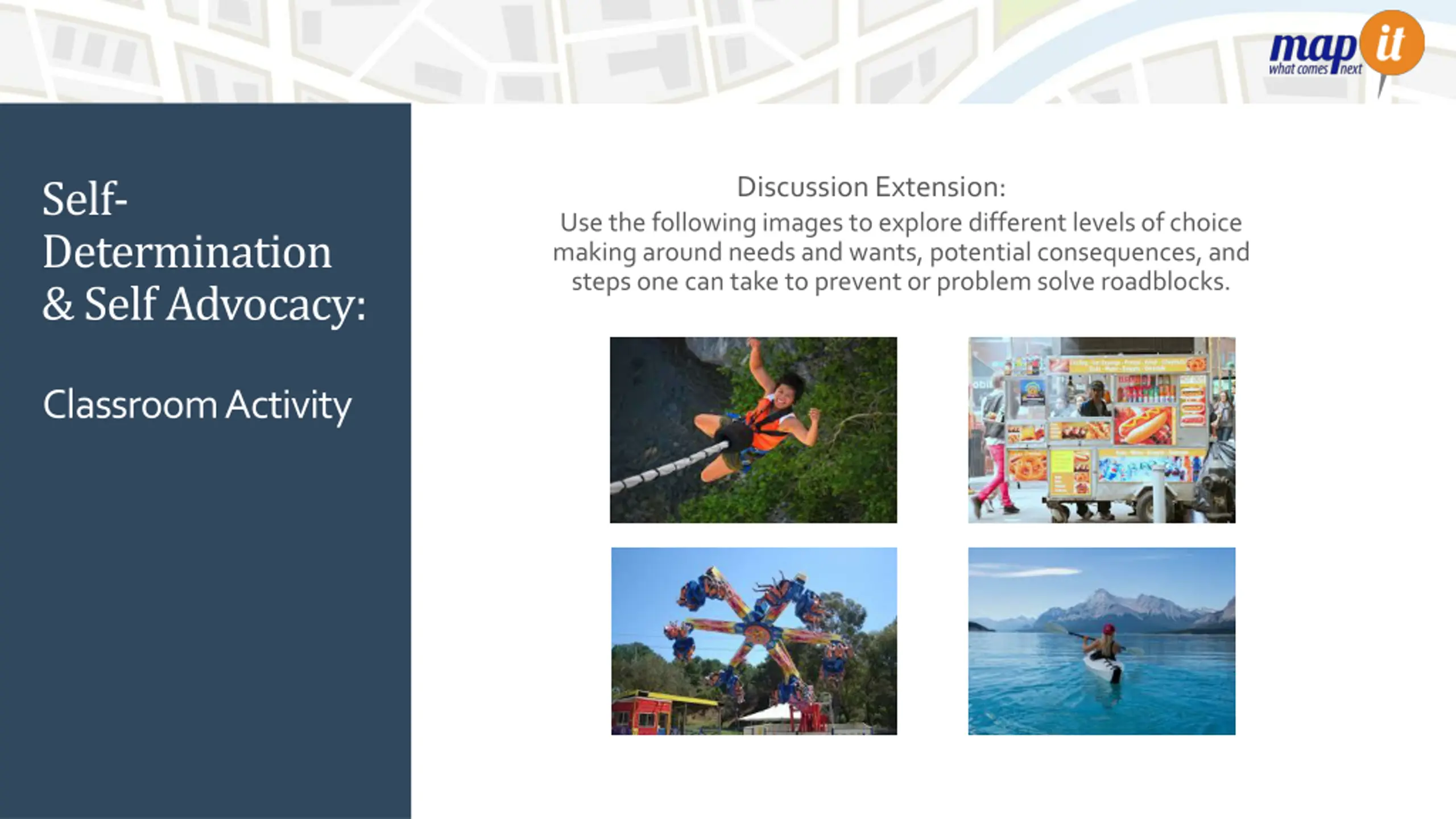 Self- Determination & Self Advocacy: Discussion Extension: Use the following images to explore different levels of choice making around needs and wants, potential consequences, and steps one can take to prevent or problem solve roadblocks. Classroom Activity