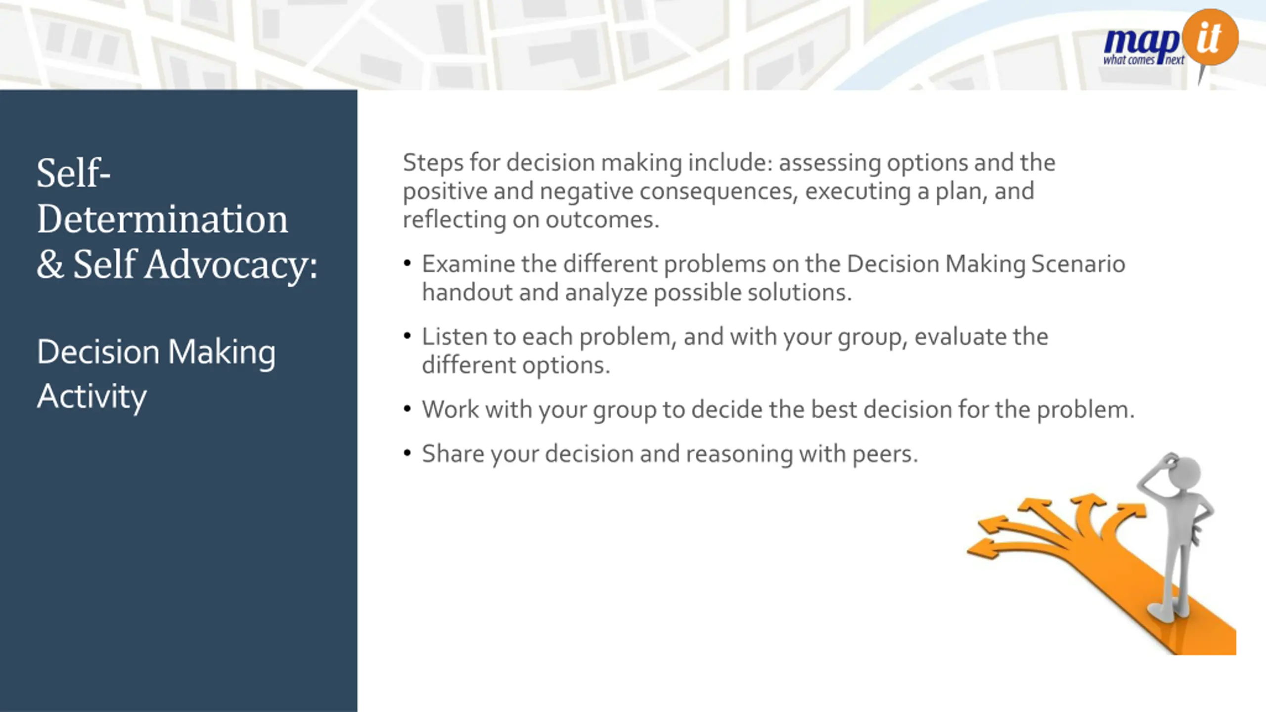 Self- Determination & Self Advocacy: Steps for decision making include: assessing options and the positive and negative consequences, executing a plan, and reflecting on outcomes. Examine the different problems on the Decision Making Scenario handout and analyze possible solutions. Listen to each problem, and with your group, evaluate the different options. Decision Making Activity Work with your group to decide the best decision for the problem. Share your decision and reasoning with peers.