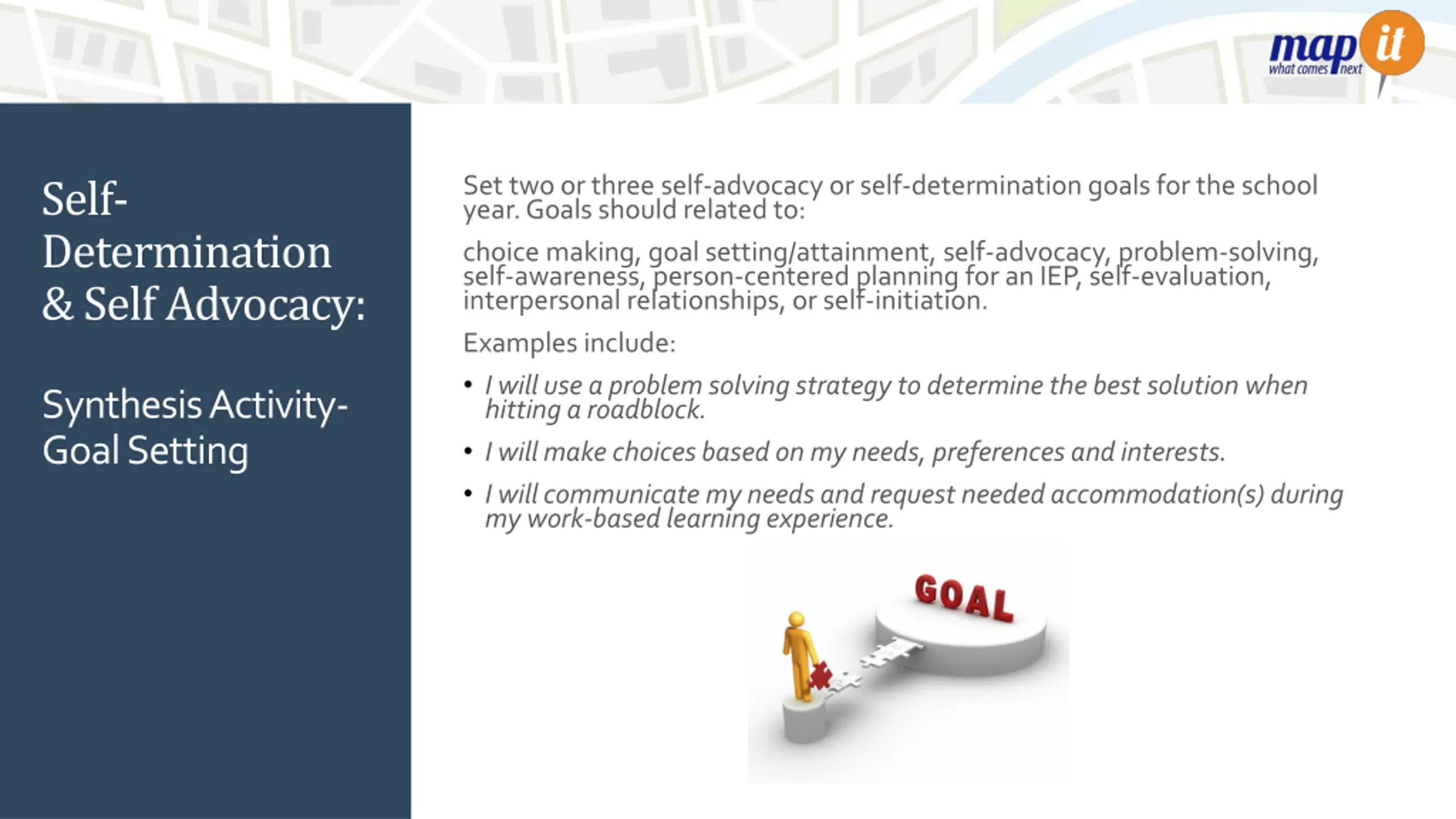 Self- Determination & Self Advocacy: Set two or three self-advocacy or self-determination goals for the school year. Goals should related to: choice making, goal setting/attainment, self-advocacy, problem-solving, self-awareness, person-centered planning for an IEP, self-evaluation, interpersonal relationships, or self-initiation. Examples include: I will use a problem solving strategy to determine the best solution when hitting a roadblock. I will make choices based on my needs, preferences and interests. I will communicate my needs and request needed accommodation(s) during my work-based learning experience. Synthesis Activity- Goal Setting