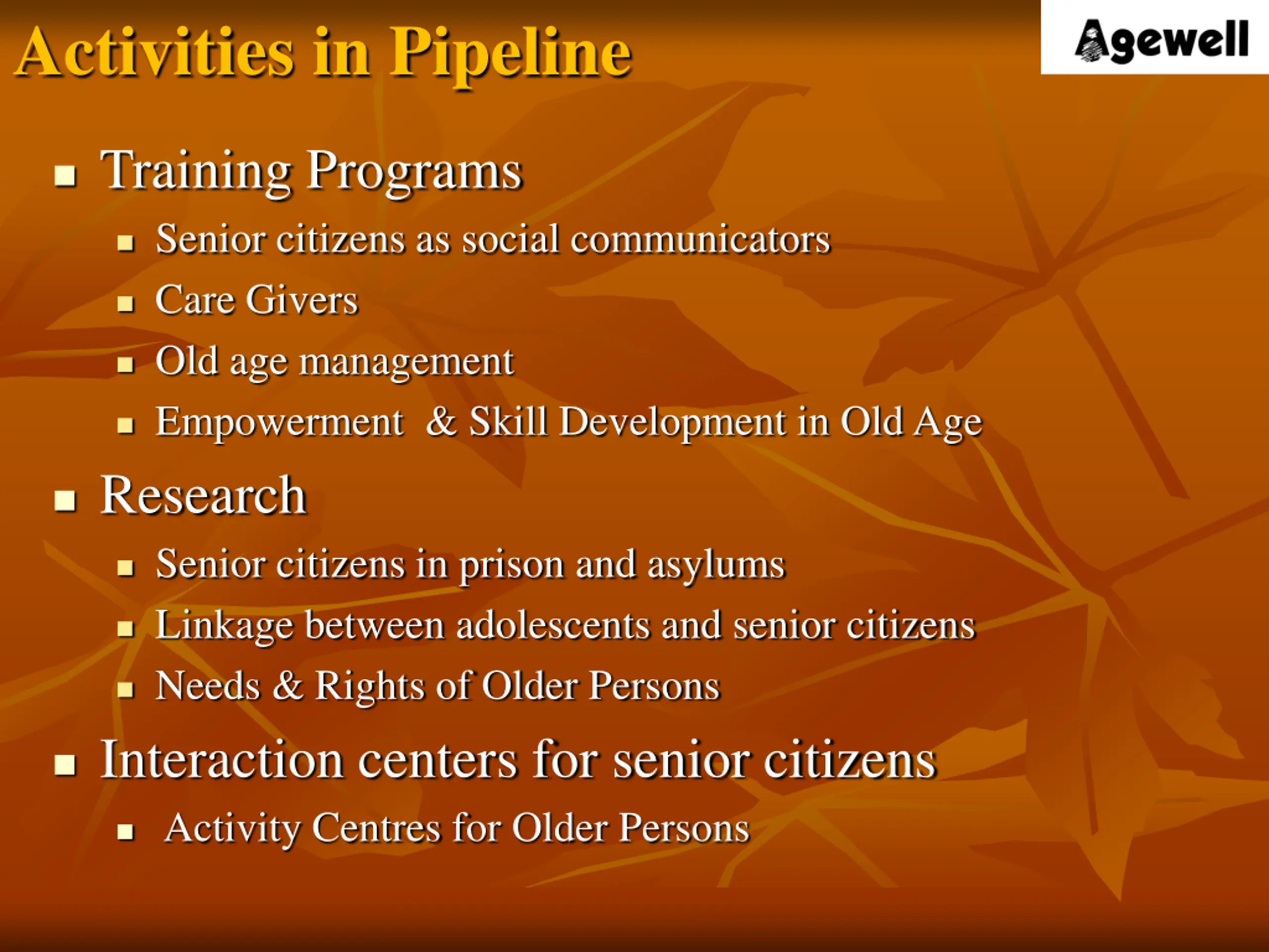 Activities in Pipeline Training Programs Senior citizens as social communicators Care Givers Old age management Empowerment & Skill Development in Old Age Research Senior citizens in prison and asylums Linkage between adolescents and senior citizens Needs & Rights of Older Persons Interaction centers for senior citizens Activity Centres for Older Persons