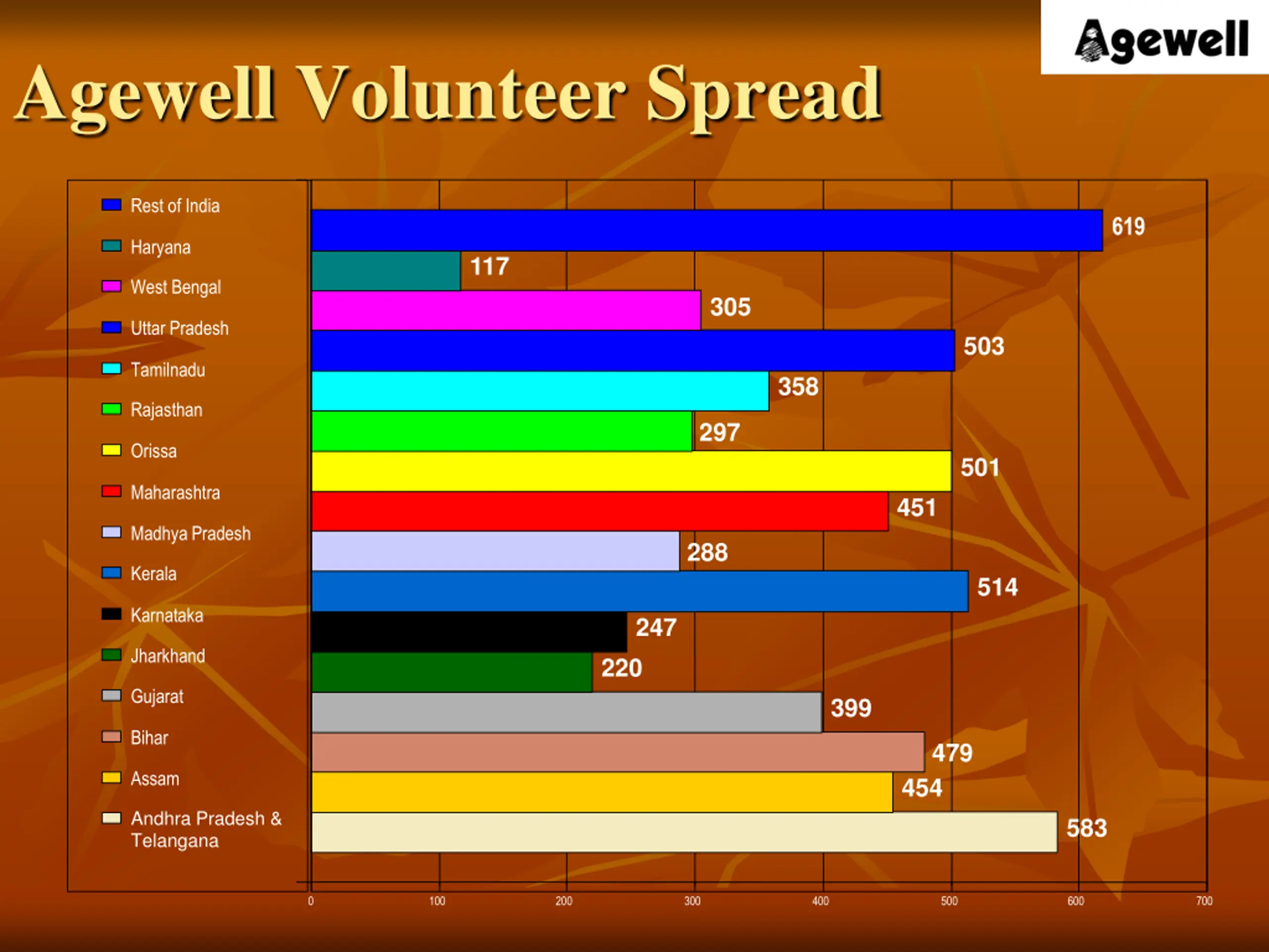 Agewell Volunteer Spread Rest of India 619 Haryana 117 West Bengal 305 Uttar Pradesh 503 Tamilnadu 358 Rajasthan 297 Orissa 501 Maharashtra 451 Madhya Pradesh 288 Kerala 514 Karnataka 247 Jharkhand 220 Gujarat 399 Bihar 479 Assam 454 Andhra Pradesh & Telangana 583 0 100 200 300 400 500 600 700