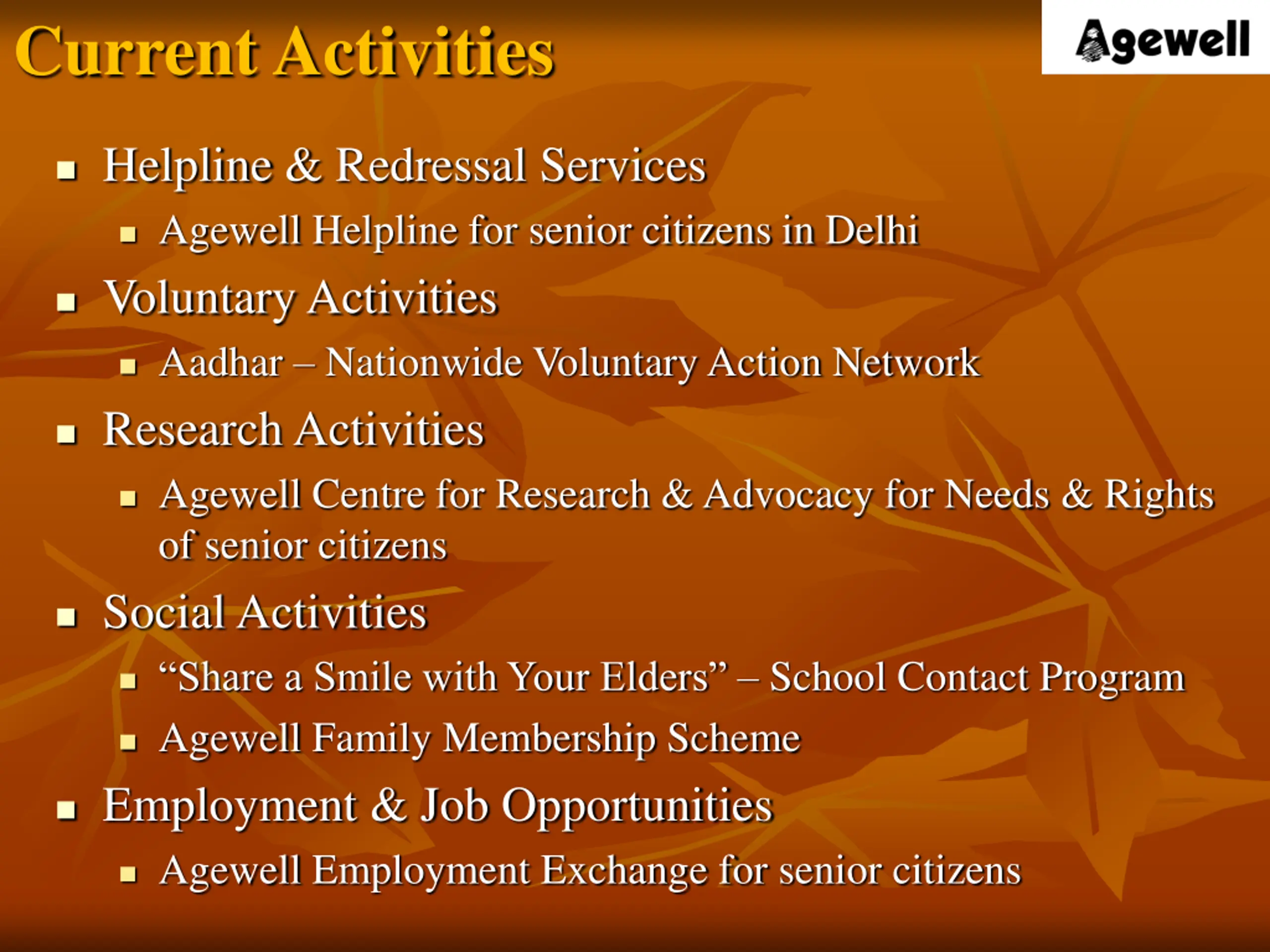 Current Activities Helpline & Redressal Services Agewell Helpline for senior citizens in Delhi Voluntary Activities Aadhar Nationwide Voluntary Action Network Research Activities Agewell Centre for Research & Advocacy for Needs & Rights of senior citizens Social Activities Share a Smile with Your Elders School Contact Program Agewell Family Membership Scheme Employment & Job Opportunities Agewell Employment Exchange for senior citizens