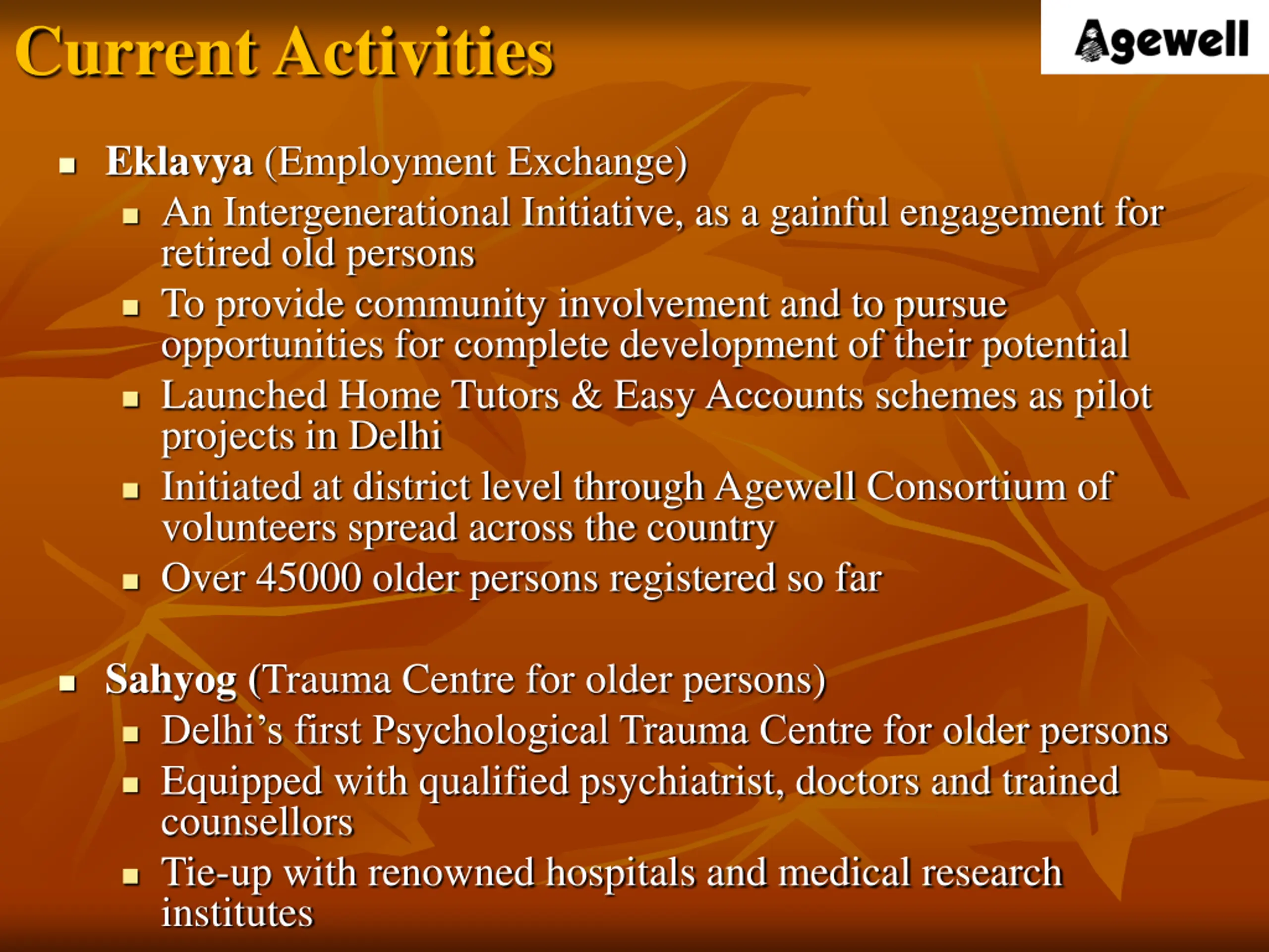 Current Activities Eklavya (Employment Exchange) An Intergenerational Initiative, as a gainful engagement for retired old persons To provide community involvement and to pursue opportunities for complete development of their potential Launched Home Tutors & Easy Accounts schemes as pilot projects in Delhi Initiated at district level through Agewell Consortium of volunteers spread across the country Over 45000 older persons registered so far Sahyog (Trauma Centre for older persons) Delhi s first Psychological Trauma Centre for older persons Equipped with qualified psychiatrist, doctors and trained counsellors Tie-up with renowned hospitals and medical research institutes