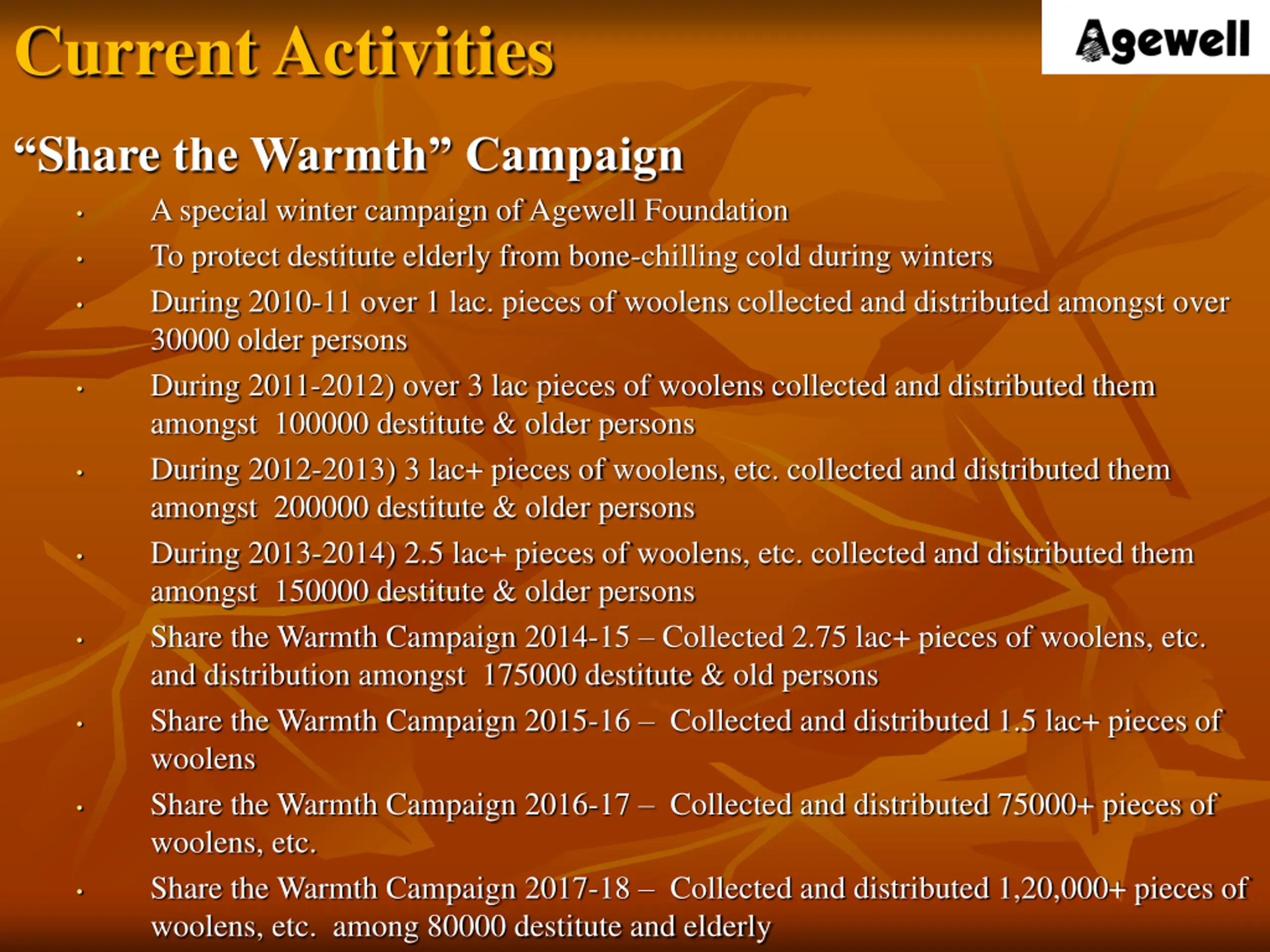 Current Activities Share the Warmth Campaign A special winter campaign of Agewell Foundation To protect destitute elderly from bone-chilling cold during winters During 2010-11 over 1 lac. pieces of woolens collected and distributed amongst over 30000 older persons During 2011-2012) over 3 lac pieces of woolens collected and distributed them amongst 100000 destitute & older persons During 2012-2013) 3 lac+ pieces of woolens, etc. collected and distributed them amongst 200000 destitute & older persons During 2013-2014) 2.5 lac+ pieces of woolens, etc. collected and distributed them amongst 150000 destitute & older persons Share the Warmth Campaign 2014-15 Collected 2.75 lac+ pieces of woolens, etc. and distribution amongst 175000 destitute & old persons Share the Warmth Campaign 2015-16 Collected and distributed 1.5 lac+ pieces of woolens Share the Warmth Campaign 2016-17 Collected and distributed 75000+ pieces of woolens, etc. Share the Warmth Campaign 2017-18 Collected and distributed 1,20,000+ pieces of woolens, etc. among 80000 destitute and elderly