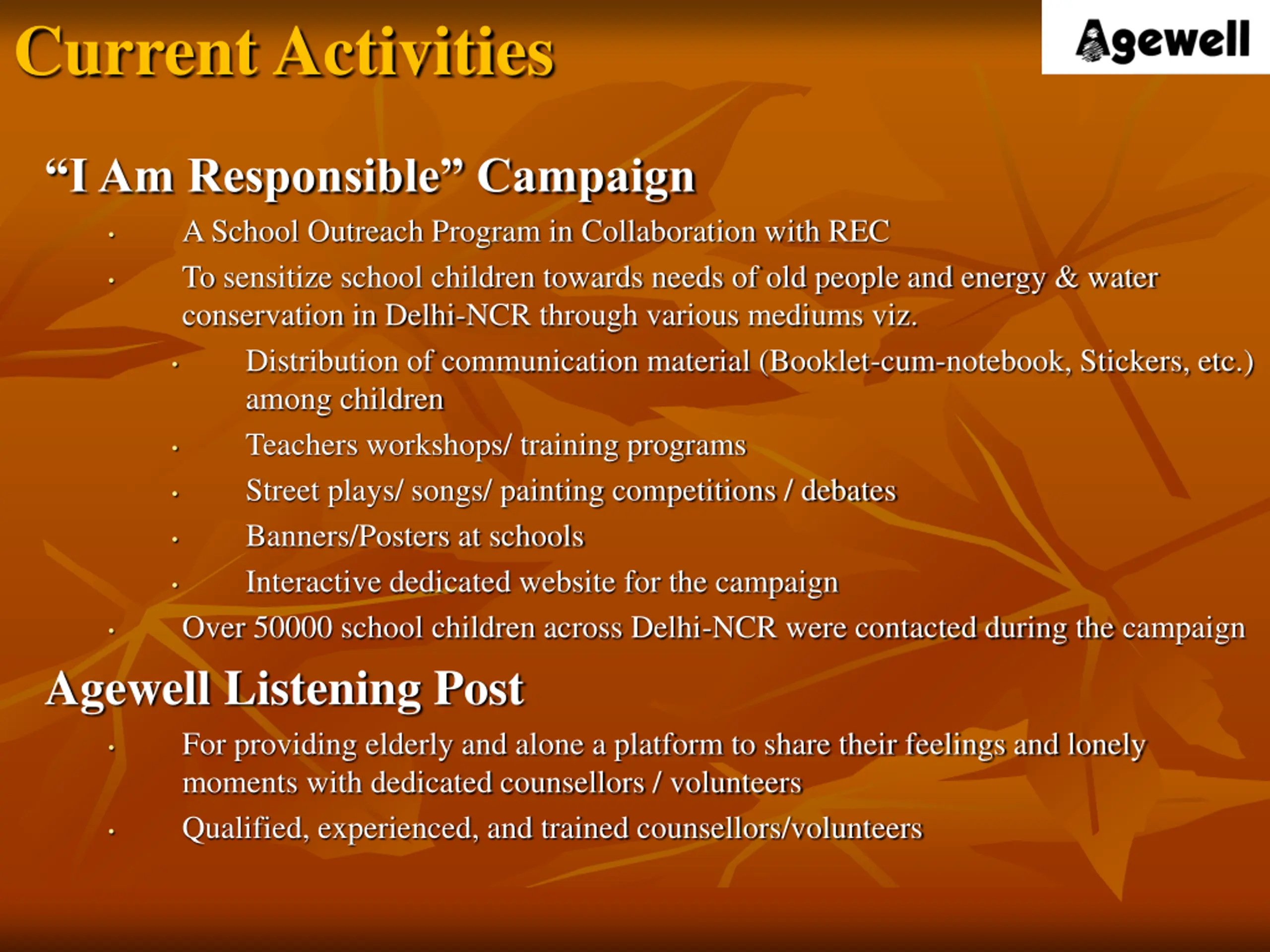 Current Activities I Am Responsible Campaign A School Outreach Program in Collaboration with REC To sensitize school children towards needs of old people and energy & water conservation in Delhi-NCR through various mediums viz. Distribution of communication material (Booklet-cum-notebook, Stickers, etc.) among children Teachers workshops/ training programs Street plays/ songs/ painting competitions / debates Banners/Posters at schools Interactive dedicated website for the campaign Over 50000 school children across Delhi-NCR were contacted during the campaign Agewell Listening Post For providing elderly and alone a platform to share their feelings and lonely moments with dedicated counsellors / volunteers Qualified, experienced, and trained counsellors/volunteers