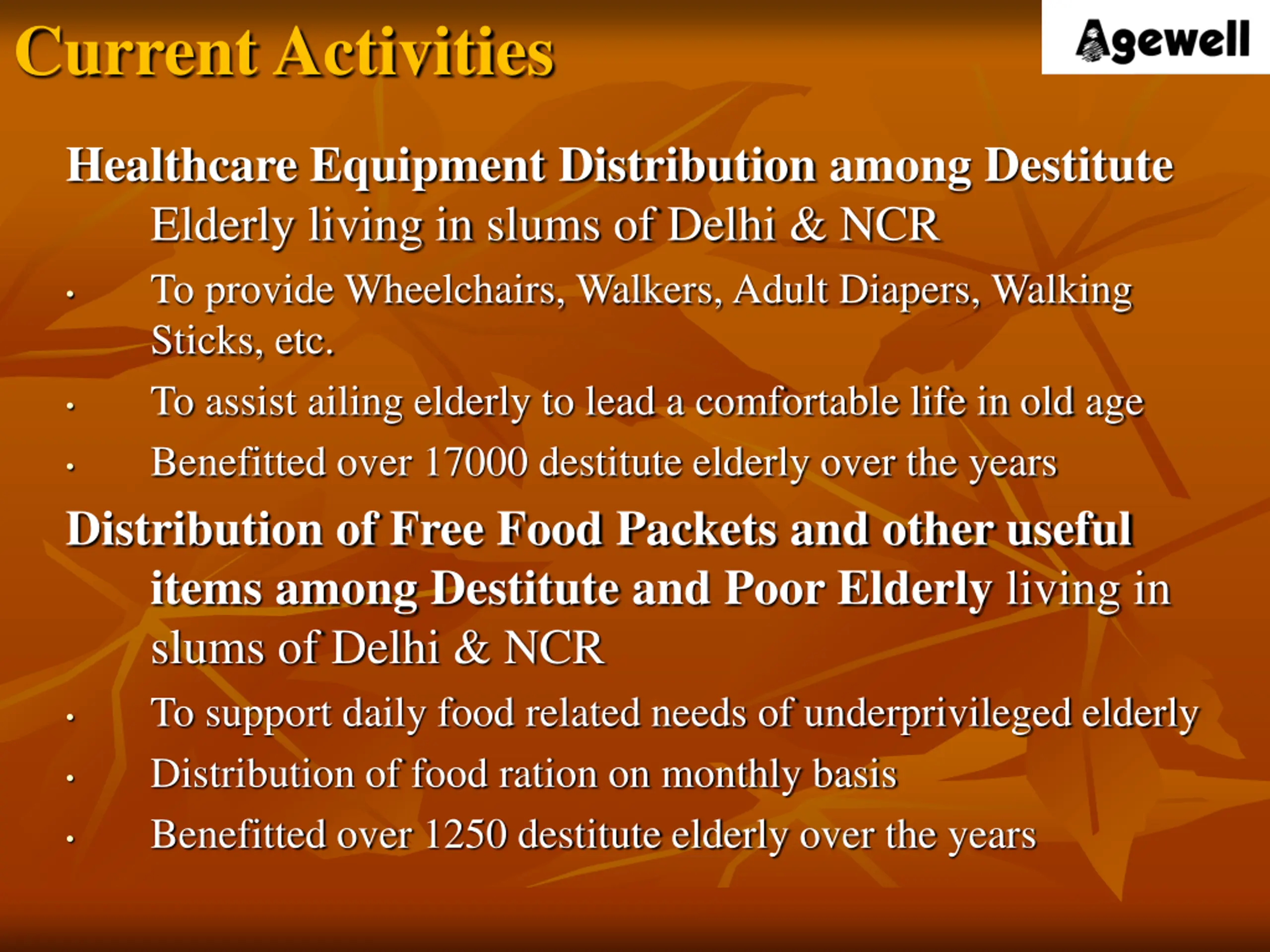 Current Activities Healthcare Equipment Distribution among Destitute Elderly living in slums of Delhi & NCR To provide Wheelchairs, Walkers, Adult Diapers, Walking Sticks, etc. To assist ailing elderly to lead a comfortable life in old age Benefitted over 17000 destitute elderly over the years Distribution of Free Food Packets and other useful items among Destitute and Poor Elderly living in slums of Delhi & NCR To support daily food related needs of underprivileged elderly Distribution of food ration on monthly basis Benefitted over 1250 destitute elderly over the years