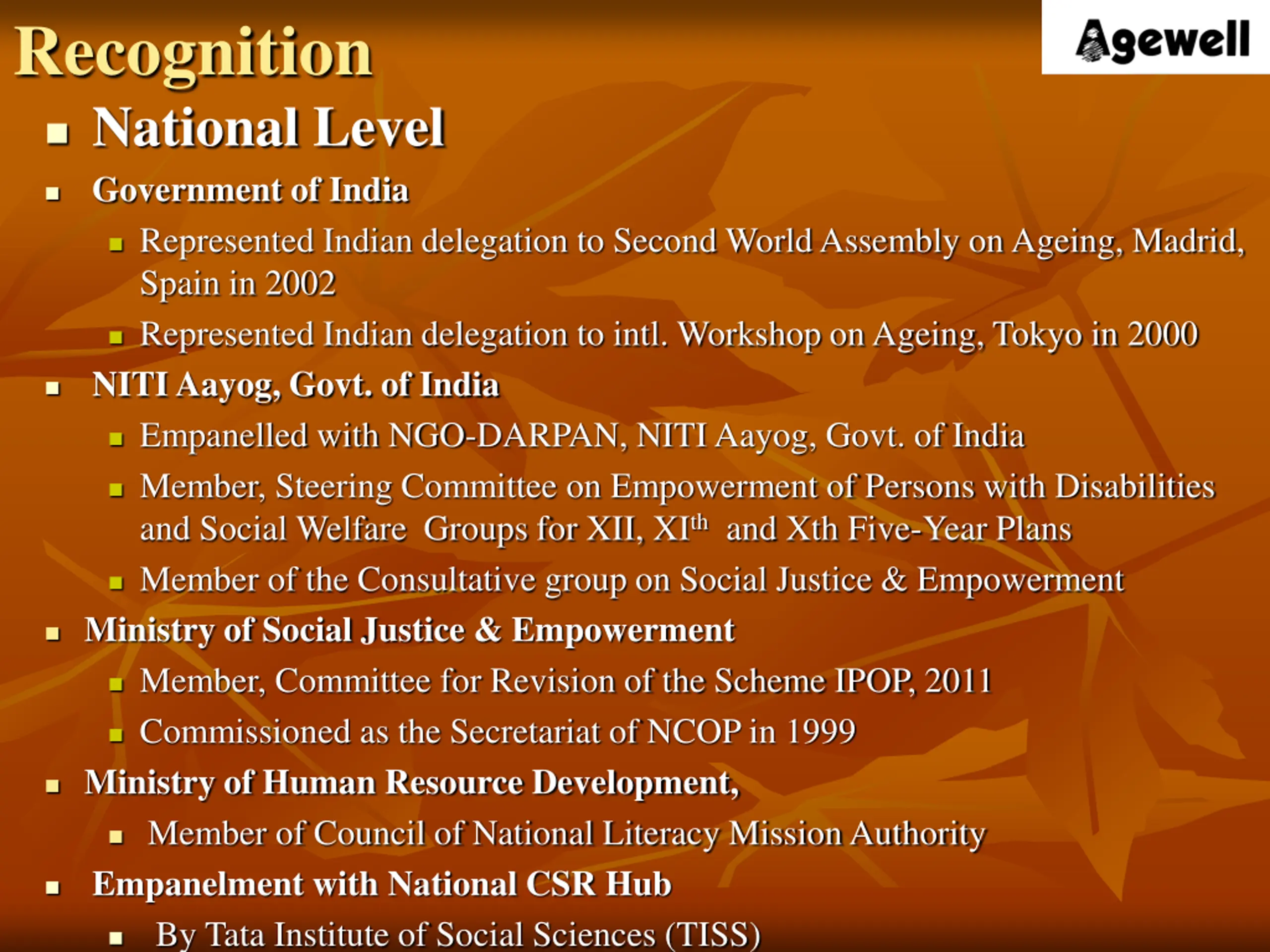 Recognition National Level Government of India Represented Indian delegation to Second World Assembly on Ageing, Madrid, Spain in 2002 Represented Indian delegation to intl. Workshop on Ageing, Tokyo in 2000 NITI Aayog, Govt. of India Empanelled with NGO-DARPAN, NITI Aayog, Govt. of India Member, Steering Committee on Empowerment of Persons with Disabilities and Social Welfare Groups for XII, XIth and Xth Five-Year Plans Member of the Consultative group on Social Justice & Empowerment Ministry of Social Justice & Empowerment Member, Committee for Revision of the Scheme IPOP, 2011 Commissioned as the Secretariat of NCOP in 1999 Ministry of Human Resource Development, Member of Council of National Literacy Mission Authority Empanelment with National CSR Hub By Tata Institute of Social Sciences (TISS)