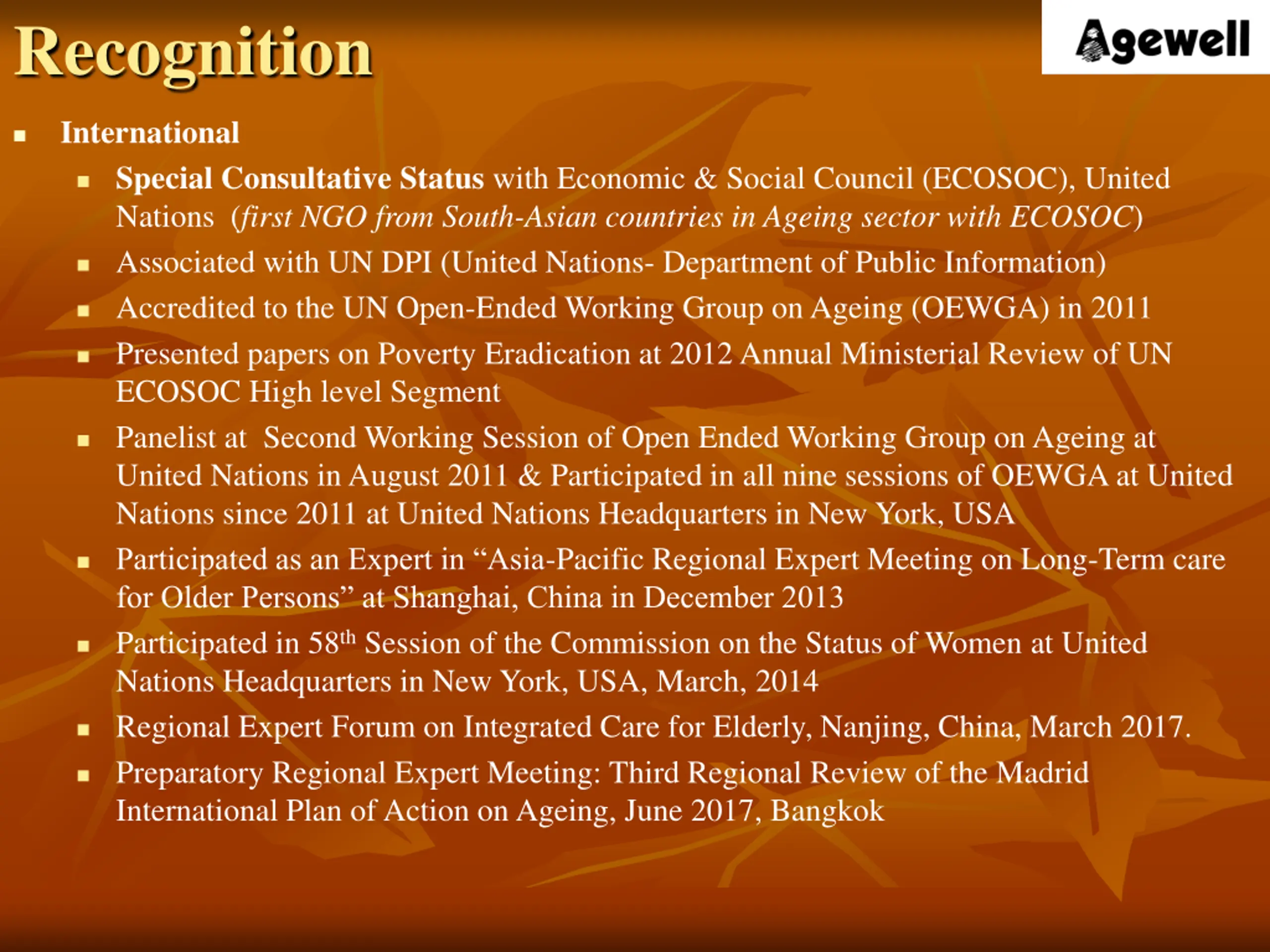 Recognition International Special Consultative Status with Economic & Social Council (ECOSOC), United Nations (first NGO from South-Asian countries in Ageing sector with ECOSOC) Associated with UN DPI (United Nations- Department of Public Information) Accredited to the UN Open-Ended Working Group on Ageing (OEWGA) in 2011 Presented papers on Poverty Eradication at 2012 Annual Ministerial Review of UN ECOSOC High level Segment Panelist at Second Working Session of Open Ended Working Group on Ageing at United Nations in August 2011 & Participated in all nine sessions of OEWGA at United Nations since 2011 at United Nations Headquarters in New York, USA Participated as an Expert in Asia-Pacific Regional Expert Meeting on Long-Term care for Older Persons at Shanghai, China in December 2013 Participated in 58th Session of the Commission on the Status of Women at United Nations Headquarters in New York, USA, March, 2014 Regional Expert Forum on Integrated Care for Elderly, Nanjing, China, March 2017. Preparatory Regional Expert Meeting: Third Regional Review of the Madrid International Plan of Action on Ageing, June 2017, Bangkok