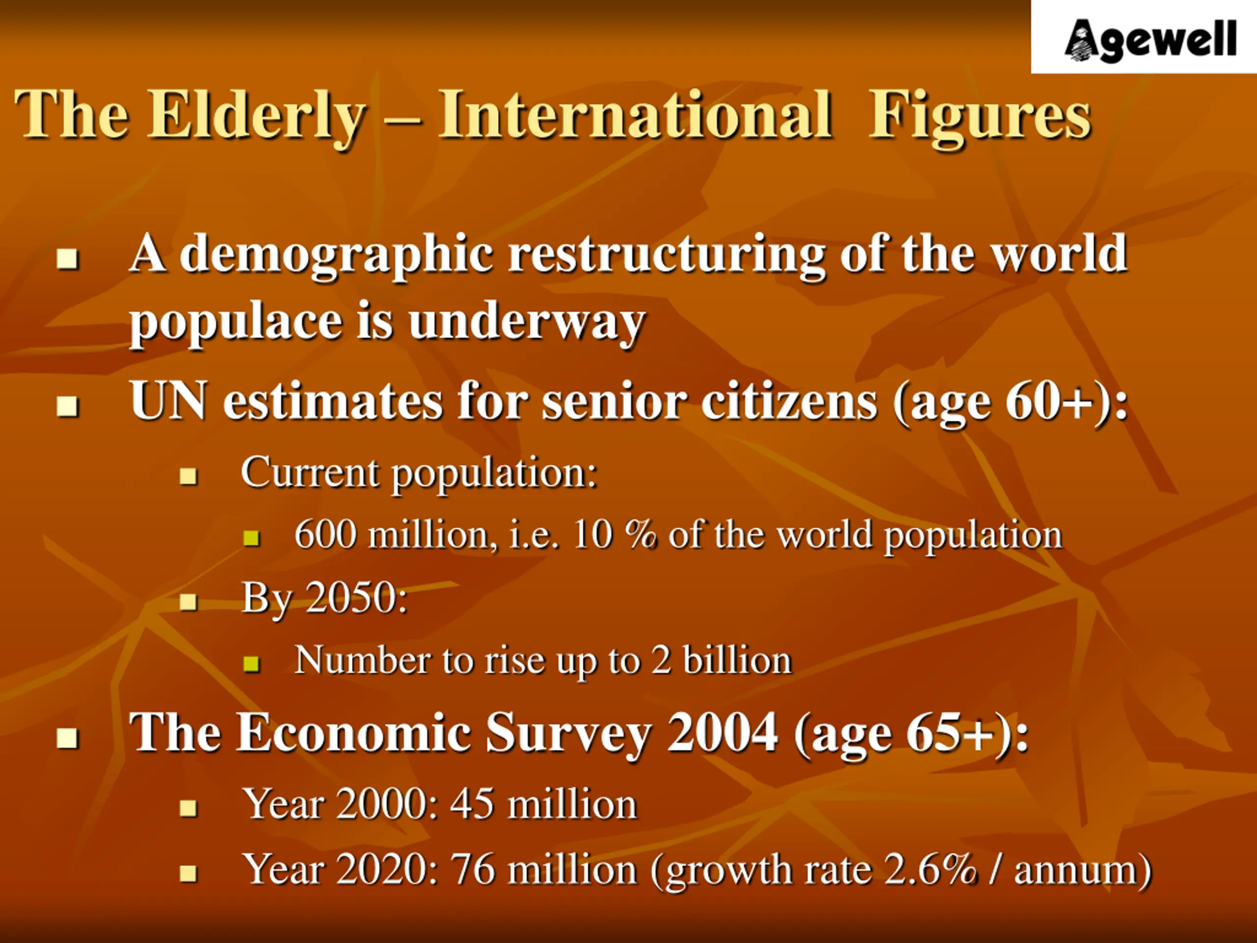 The Elderly International Figures A demographic restructuring of the world populace is underway UN estimates for senior citizens (age 60+): Current population: 600 million, i.e. 10 % of the world population By 2050: Number to rise up to 2 billion The Economic Survey 2004 (age 65+): Year 2000: 45 million Year 2020: 76 million (growth rate 2.6% / annum)