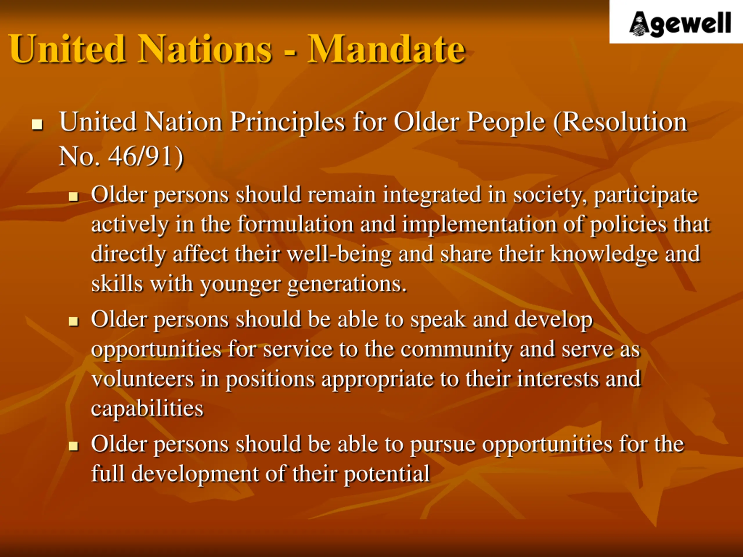 United Nations - Mandate United Nation Principles for Older People (Resolution No. 46/91) Older persons should remain integrated in society, participate actively in the formulation and implementation of policies that directly affect their well-being and share their knowledge and skills with younger generations. Older persons should be able to speak and develop opportunities for service to the community and serve as volunteers in positions appropriate to their interests and capabilities Older persons should be able to pursue opportunities for the full development of their potential