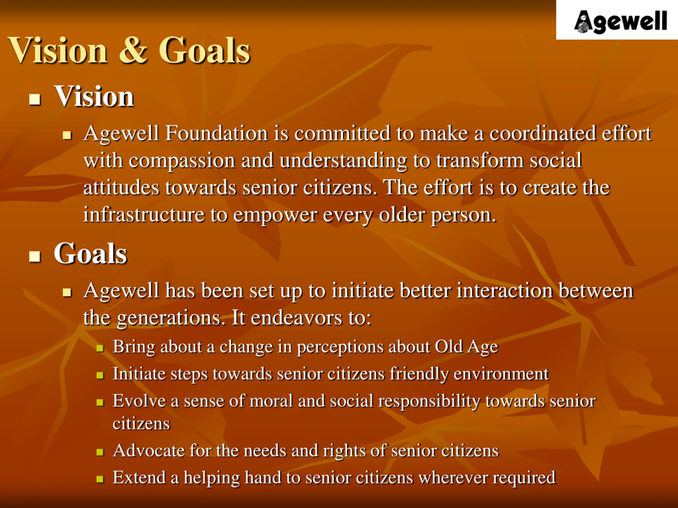 Vision & Goals Vision Agewell Foundation is committed to make a coordinated effort with compassion and understanding to transform social attitudes towards senior citizens. The effort is to create the infrastructure to empower every older person. Goals Agewell has been set up to initiate better interaction between the generations. It endeavors to: Bring about a change in perceptions about Old Age Initiate steps towards senior citizens friendly environment Evolve a sense of moral and social responsibility towards senior citizens Advocate for the needs and rights of senior citizens Extend a helping hand to senior citizens wherever required
