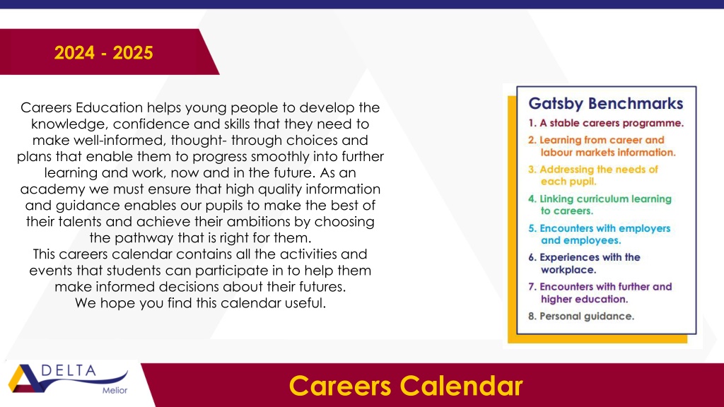 2024 - 2025 Careers Education helps young people to develop the knowledge, confidence and skills that they need to make well-informed, thought- through choices and plans that enable them to progress smoothly into further learning and work, now and in the future. As an academy we must ensure that high quality information and guidance enables our pupils to make the best of their talents and achieve their ambitions by choosing the pathway that is right for them. This careers calendar contains all the activities and events that students can participate in to help them make informed decisions about their futures. We hope you find this calendar useful. Careers Calendar