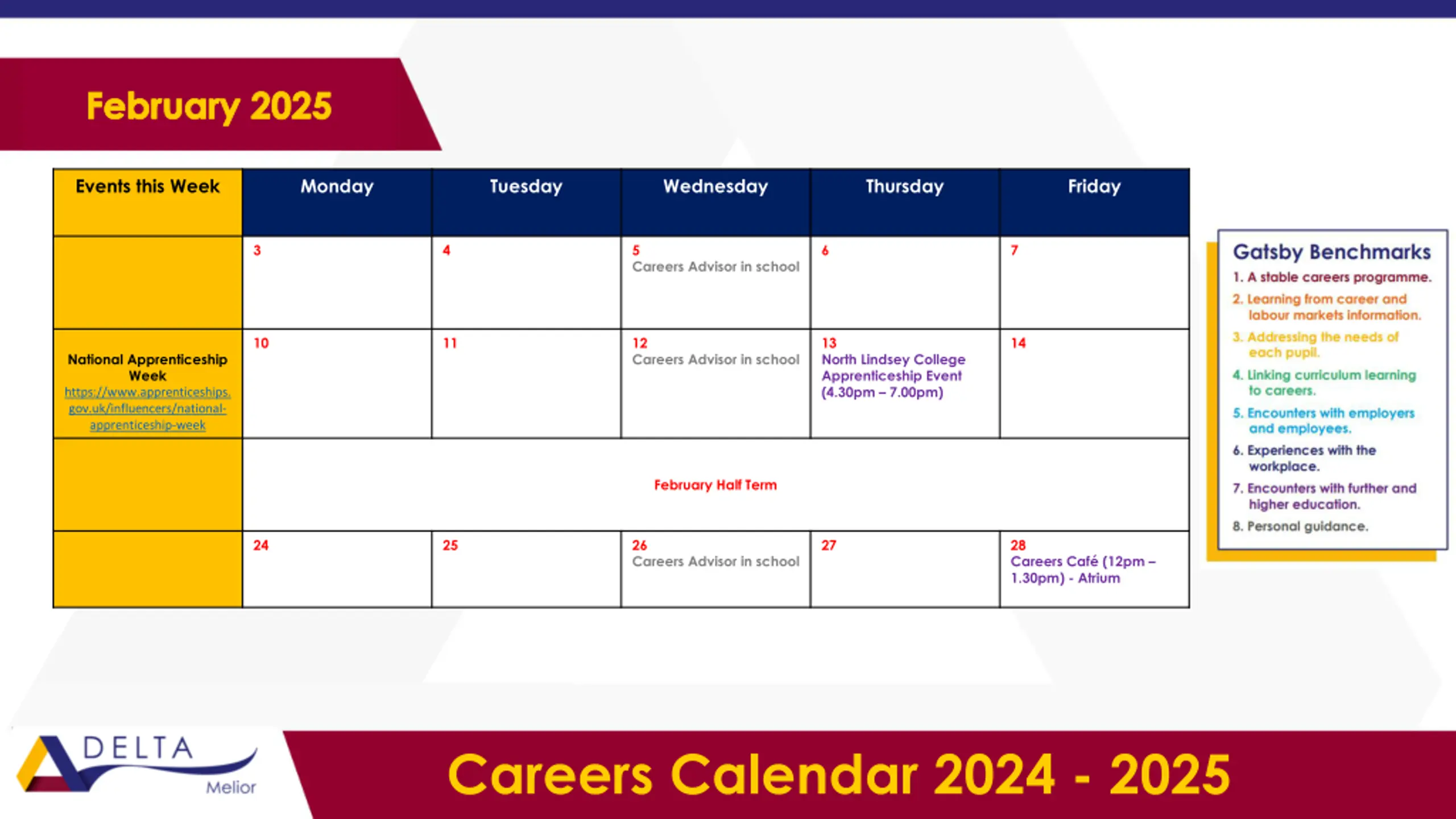 February 2025 Events this Week Monday Tuesday Wednesday Thursday Friday 3 4 5 Careers Advisor in school 6 7 10 11 12 Careers Advisor in school 13 North Lindsey College Apprenticeship Event (4.30pm 7.00pm) 14 National Apprenticeship Week https://www.apprenticeships. gov.uk/influencers/national- apprenticeship-week February Half Term 24 25 26 Careers Advisor in school 27 28 Careers Caf (12pm 1.30pm) - Atrium Careers Calendar 2024 - 2025