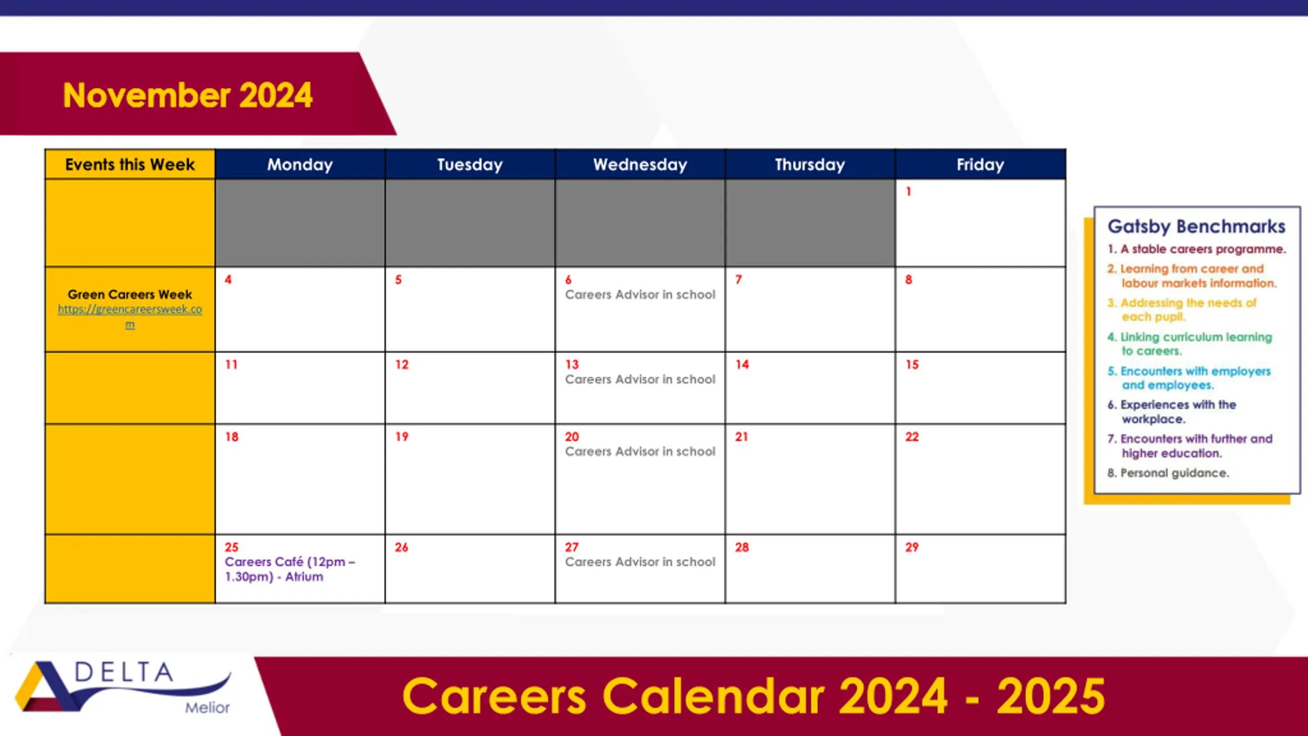 November 2024 Events this Week Monday Tuesday Wednesday Thursday Friday 1 4 5 6 Careers Advisor in school 7 8 Green Careers Week https://greencareersweek.co m 11 12 13 Careers Advisor in school 14 15 18 19 20 Careers Advisor in school 21 22 25 Careers Caf (12pm 1.30pm) - Atrium 26 27 Careers Advisor in school 28 29 Careers Calendar 2024 - 2025