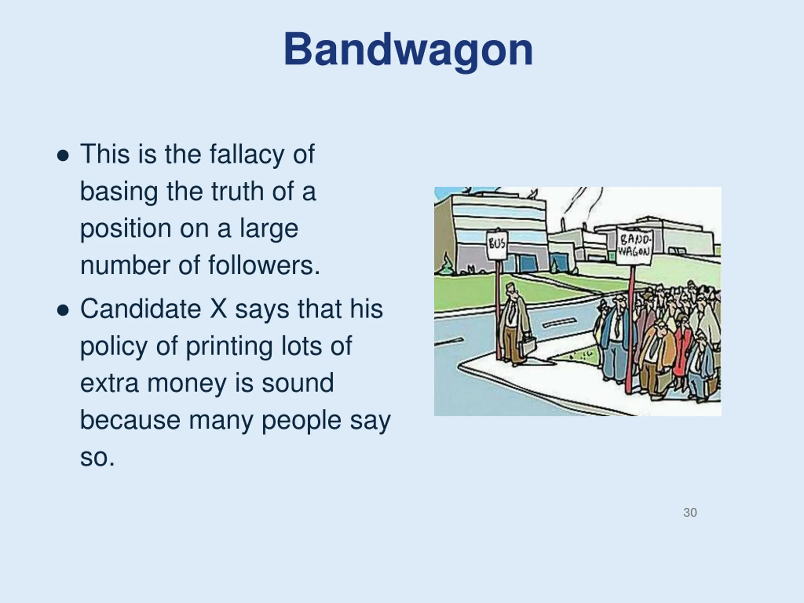 Bandwagon This is the fallacy of basing the truth of a position on a large number of followers. Candidate X says that his policy of printing lots of extra money is sound because many people say so. 30