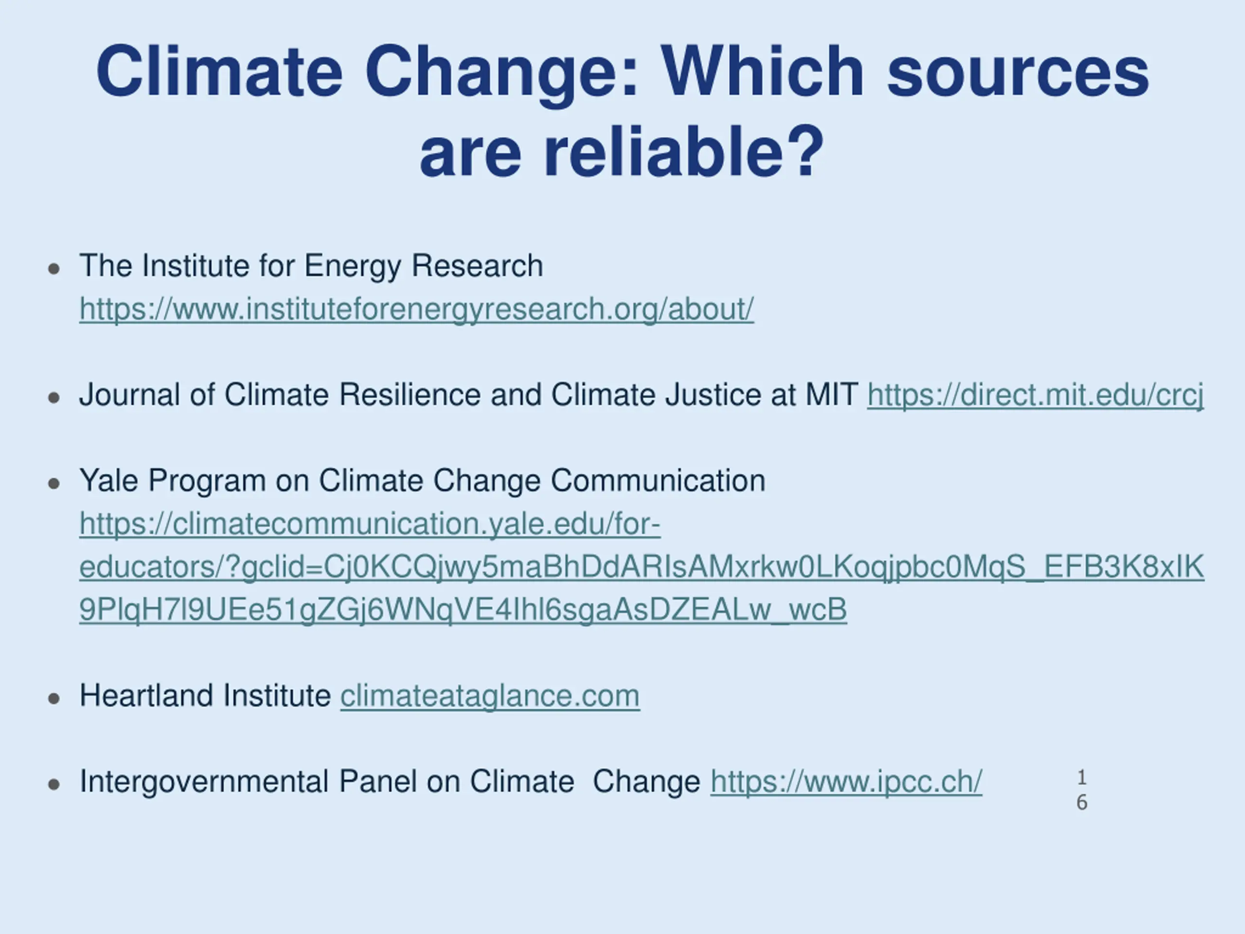 Climate Change: Which sources are reliable? The Institute for Energy Research https://www.instituteforenergyresearch.org/about/ Journal of Climate Resilience and Climate Justice at MIT https://direct.mit.edu/crcj Yale Program on Climate Change Communication https://climatecommunication.yale.edu/for- educators/?gclid=Cj0KCQjwy5maBhDdARIsAMxrkw0LKoqjpbc0MqS_EFB3K8xIK 9PlqH7l9UEe51gZGj6WNqVE4Ihl6sgaAsDZEALw_wcB Heartland Institute climateataglance.com Intergovernmental Panel on Climate Change https://www.ipcc.ch/ 1 6