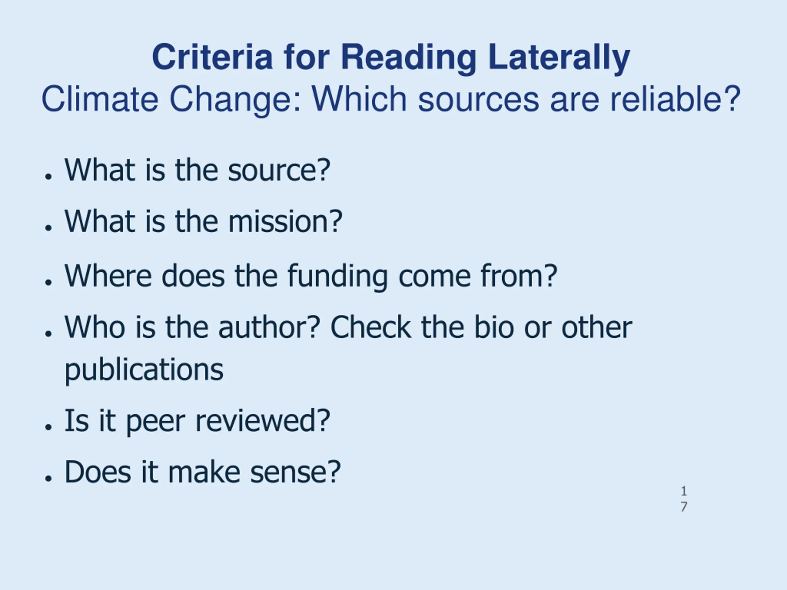 Criteria for Reading Laterally Climate Change: Which sources are reliable? What is the source? What is the mission? Where does the funding come from? Who is the author? Check the bio or other publications Is it peer reviewed? Does it make sense? 1 7