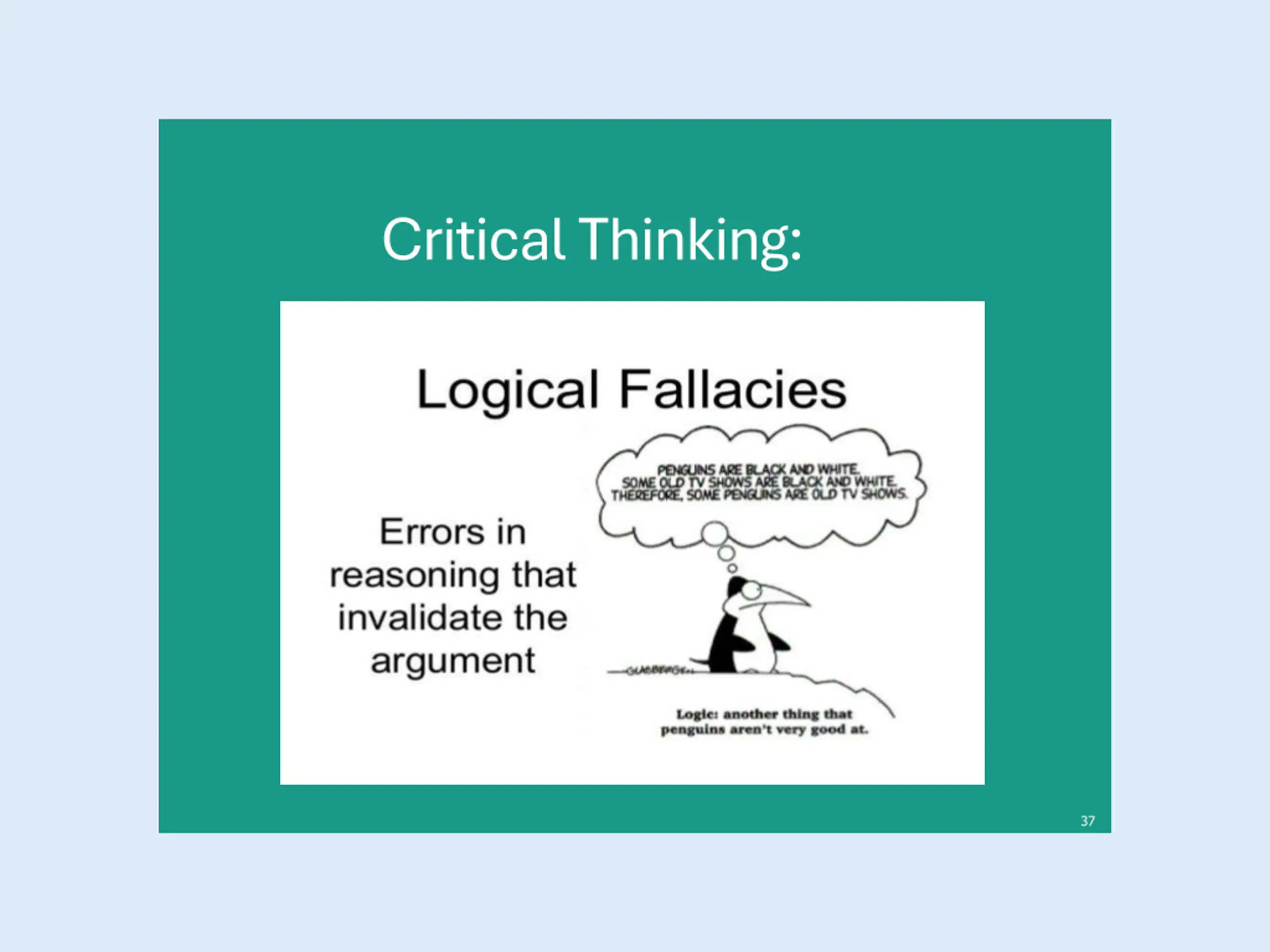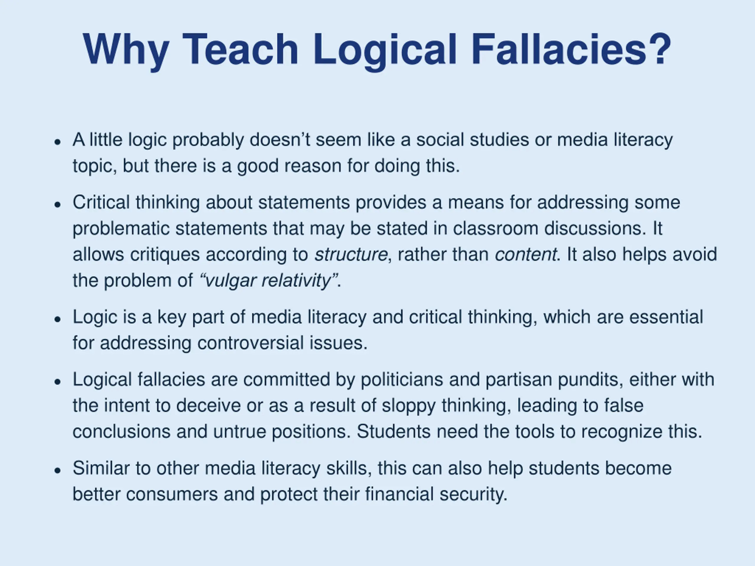 Why Teach Logical Fallacies? A little logic probably doesn t seem like a social studies or media literacy topic, but there is a good reason for doing this. Critical thinking about statements provides a means for addressing some problematic statements that may be stated in classroom discussions. It allows critiques according to structure, rather than content. It also helps avoid the problem of vulgar relativity . Logic is a key part of media literacy and critical thinking, which are essential for addressing controversial issues. Logical fallacies are committed by politicians and partisan pundits, either with the intent to deceive or as a result of sloppy thinking, leading to false conclusions and untrue positions. Students need the tools to recognize this. Similar to other media literacy skills, this can also help students become better consumers and protect their financial security.
