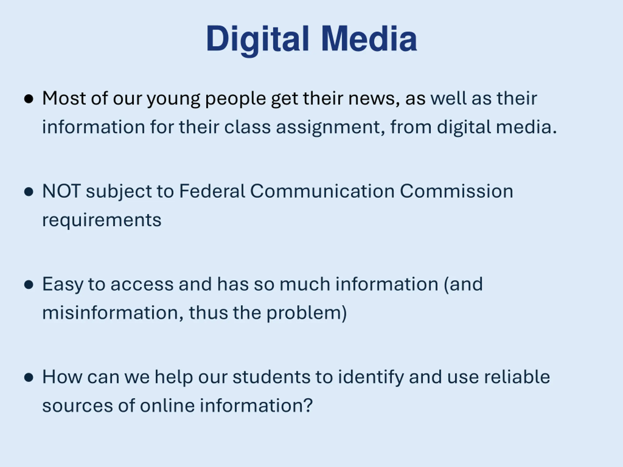 Digital Media Most of our young people get their news, as well as their information for their class assignment, from digital media. NOT subject to Federal Communication Commission requirements Easy to access and has so much information (and misinformation, thus the problem) How can we help our students to identify and use reliable sources of online information?