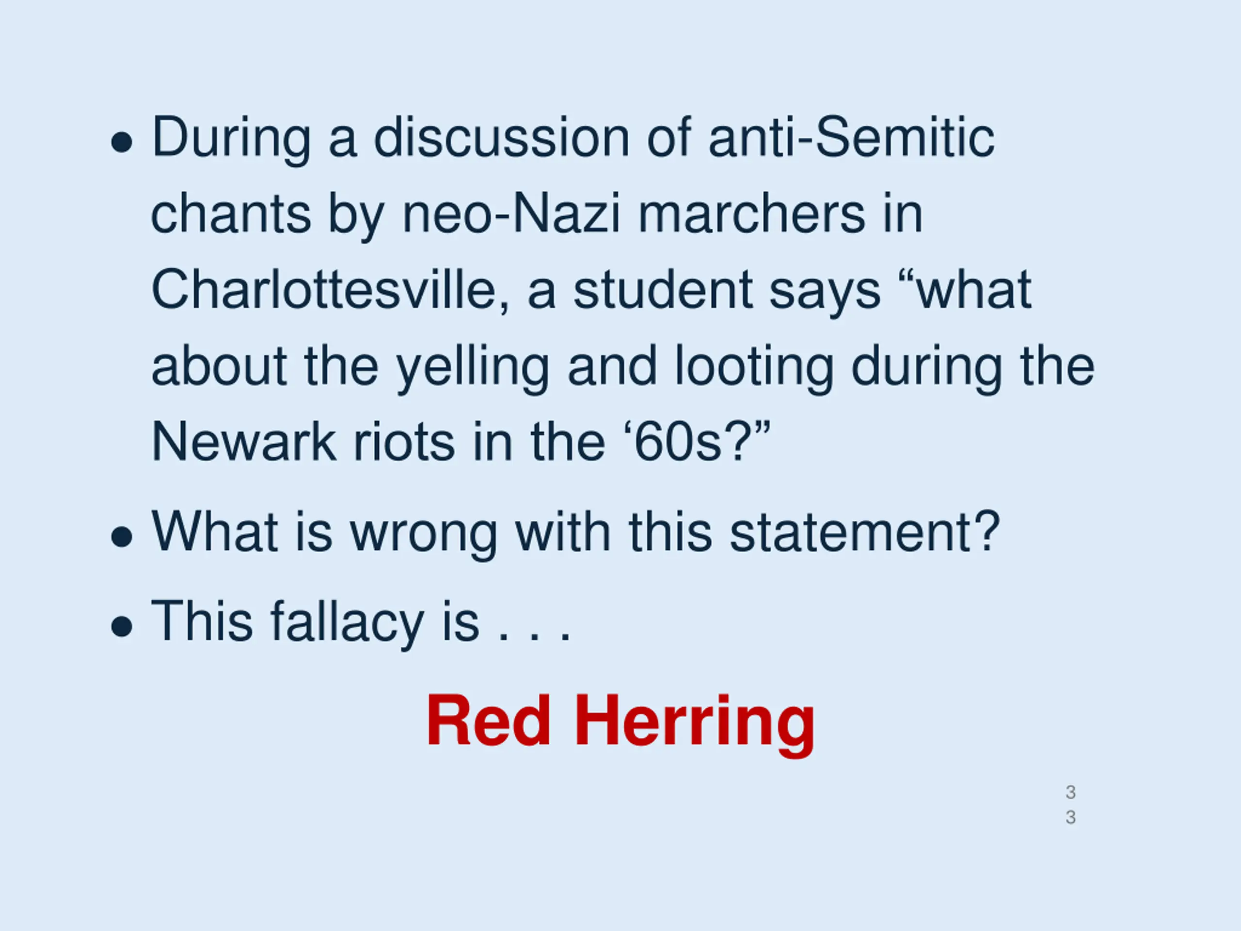 During a discussion of anti-Semitic chants by neo-Nazi marchers in Charlottesville, a student says what about the yelling and looting during the Newark riots in the 60s? What is wrong with this statement? This fallacy is . . . Red Herring 3 3
