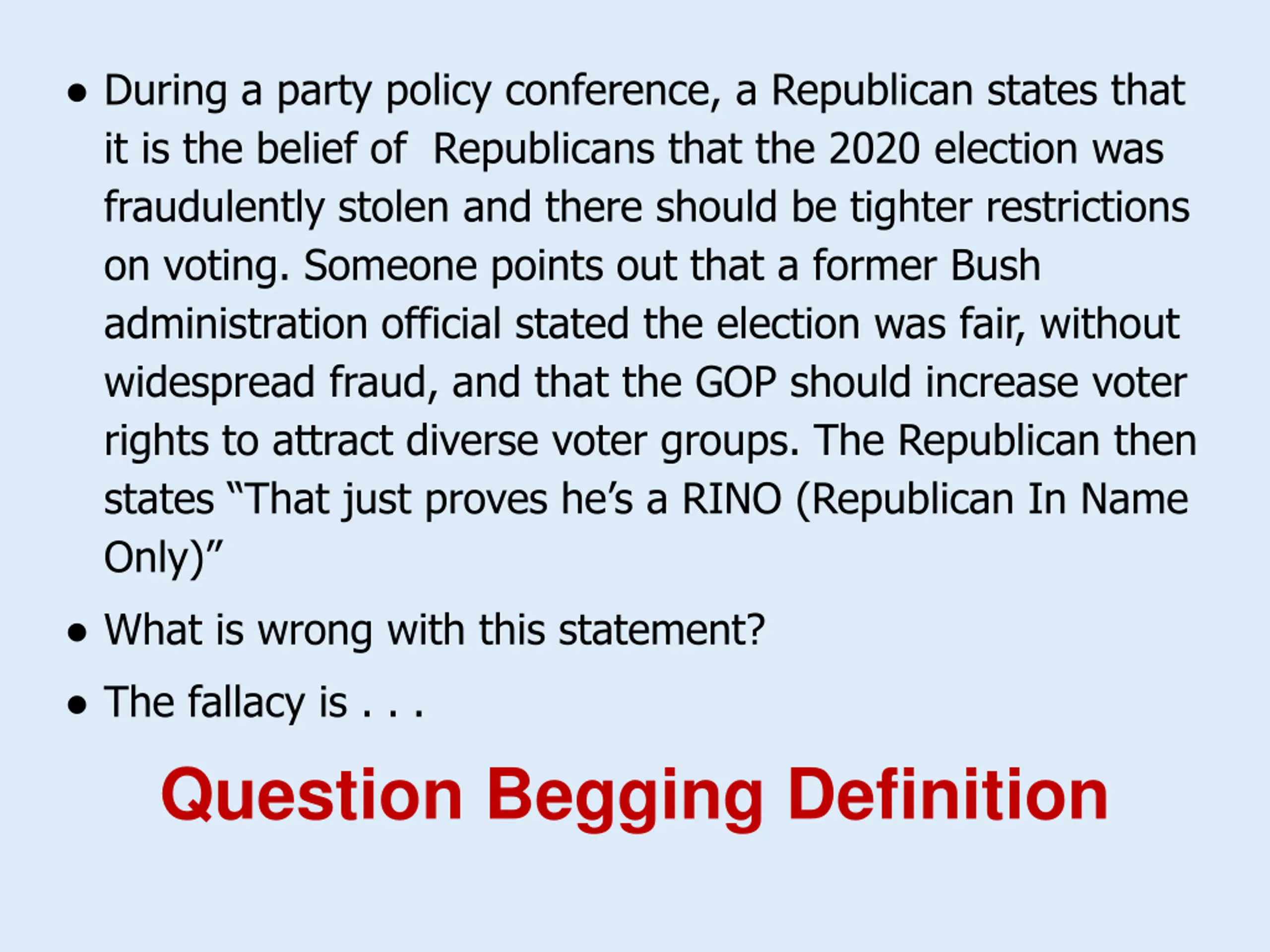 During a party policy conference, a Republican states that it is the belief of Republicans that the 2020 election was fraudulently stolen and there should be tighter restrictions on voting. Someone points out that a former Bush administration official stated the election was fair, without widespread fraud, and that the GOP should increase voter rights to attract diverse voter groups. The Republican then states That just proves he s a RINO (Republican In Name Only) What is wrong with this statement? The fallacy is . . . Question Begging Definition