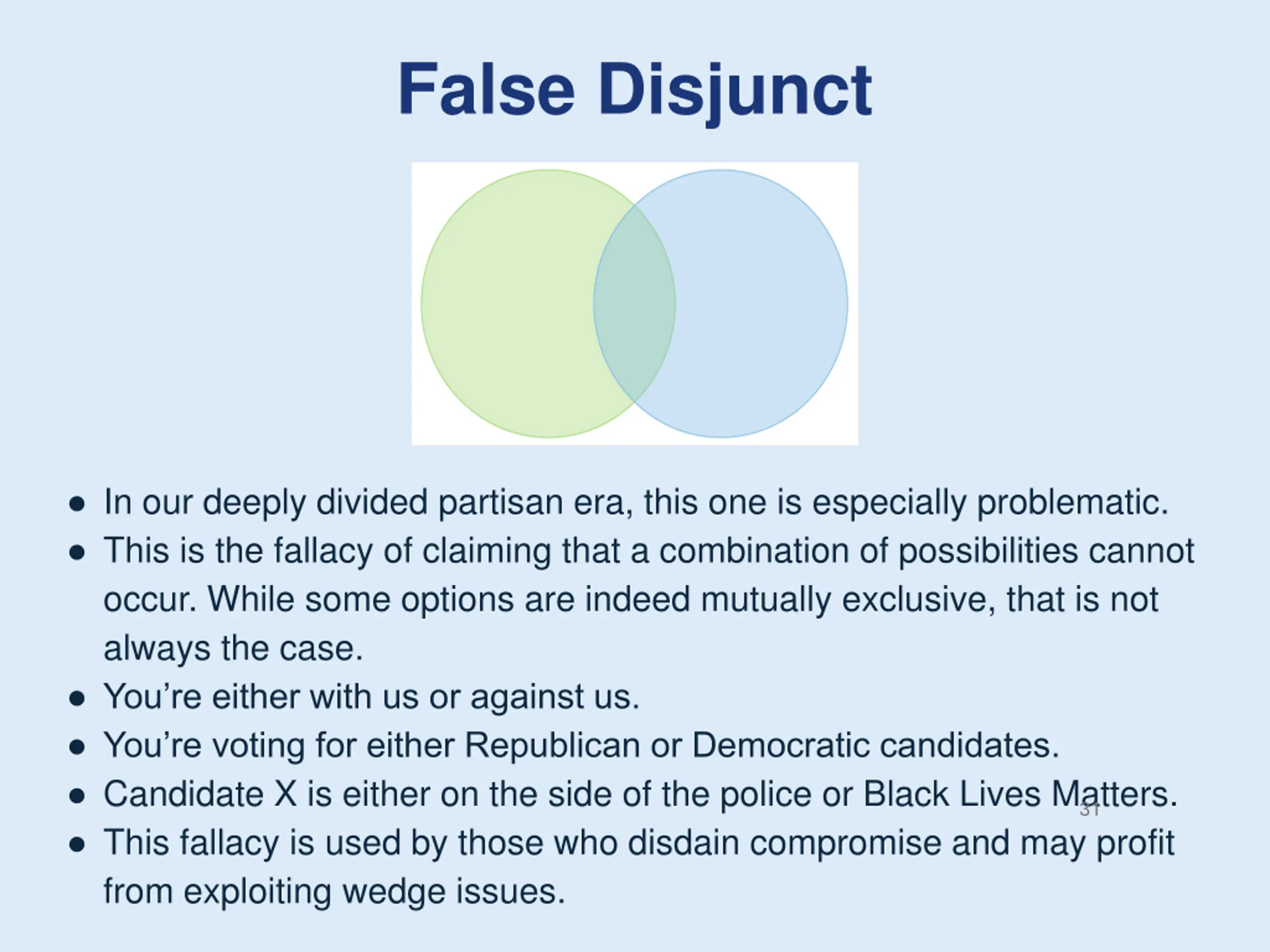 False Disjunct In our deeply divided partisan era, this one is especially problematic. This is the fallacy of claiming that a combination of possibilities cannot occur. While some options are indeed mutually exclusive, that is not always the case. You re either with us or against us. You re voting for either Republican or Democratic candidates. Candidate X is either on the side of the police or Black Lives Matters. This fallacy is used by those who disdain compromise and may profit from exploiting wedge issues. 31