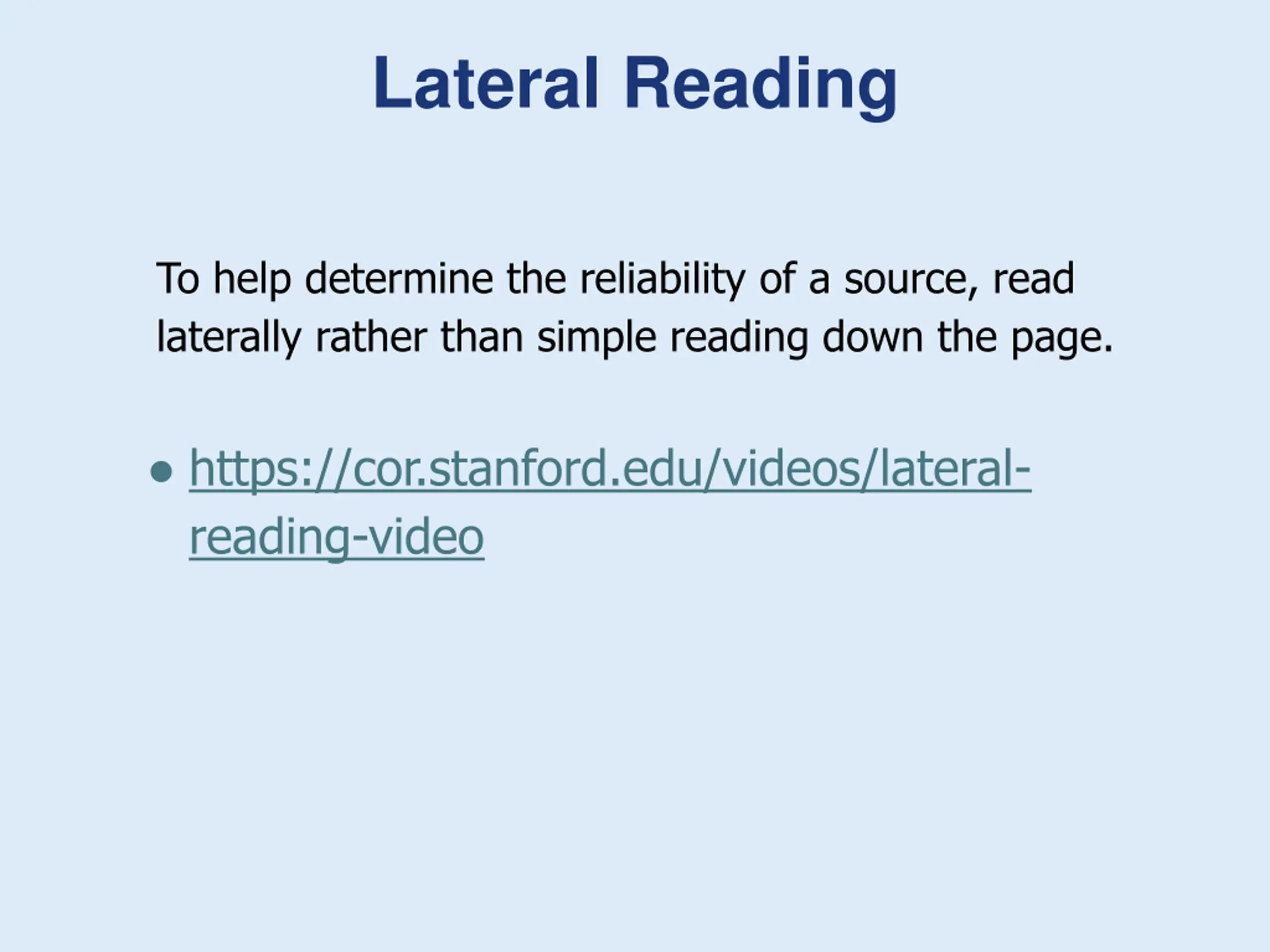 Lateral Reading To help determine the reliability of a source, read laterally rather than simple reading down the page. https://cor.stanford.edu/videos/lateral- reading-video